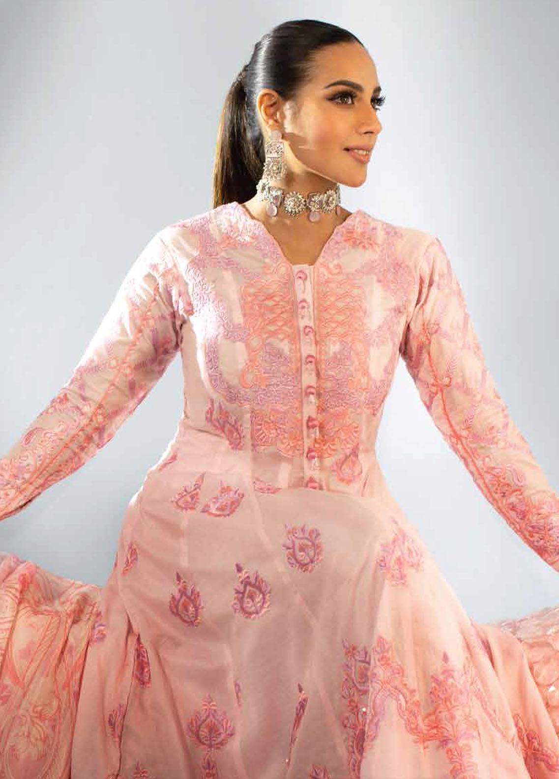 Run on schiffli shirt with complementary embroidered neckline and border filled with satin stitch technique in whites paired with medium silk digital dupatta printed with rosettes fused with decorative geometric prints in muted pink tones and white base.