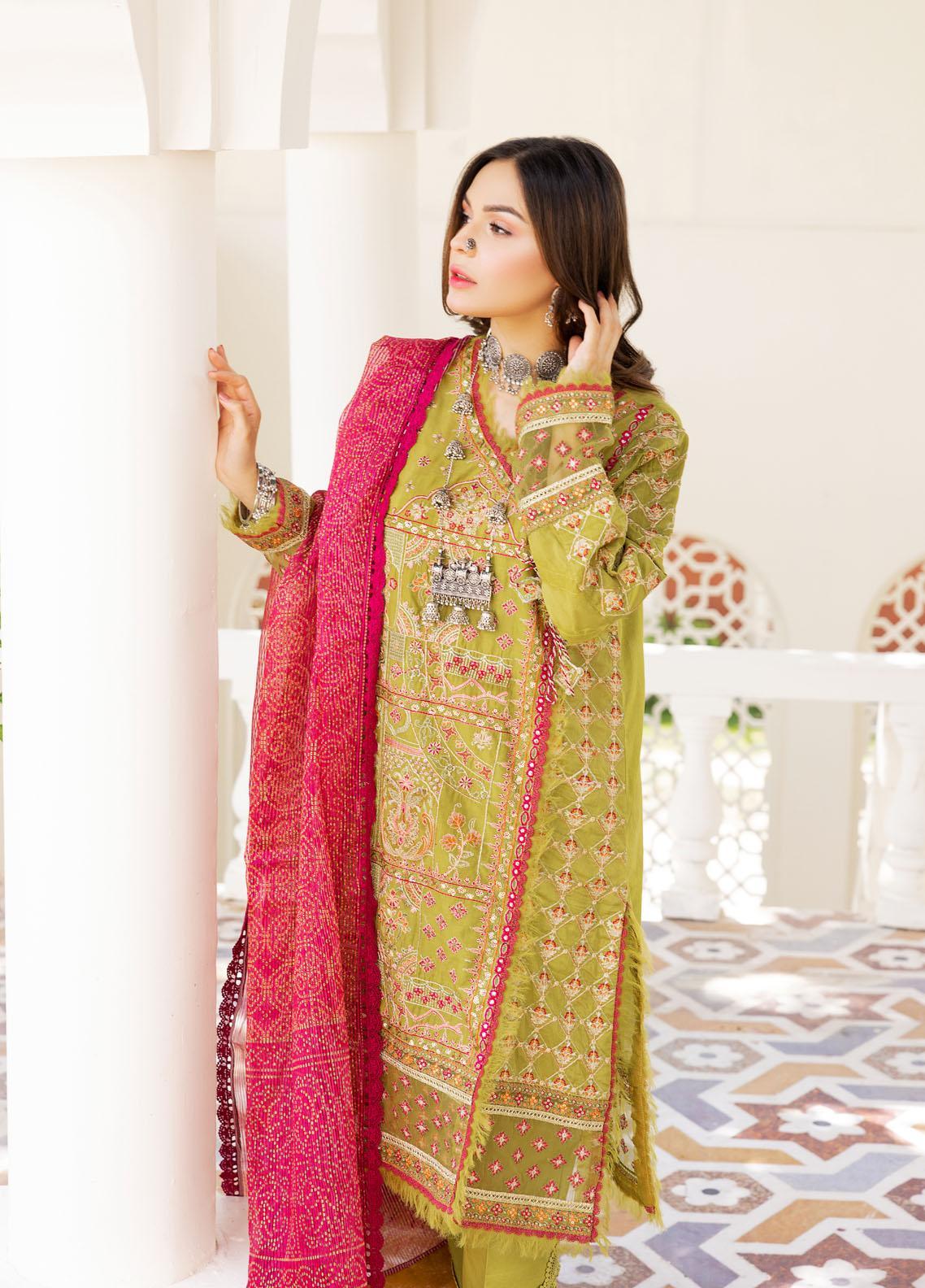 A Parrot-Hued Fabric With Embroidered Front, Left, Right, And Centre Panels With Embroidered Borders For The Front And Back. It Has A Dyed Lawn Plain Back And Sleeves With Embroidered Sleeves Border. The Ensemble Comes With Plain Trousers And A Digitally Printed Jacquard Woven Dupatta.