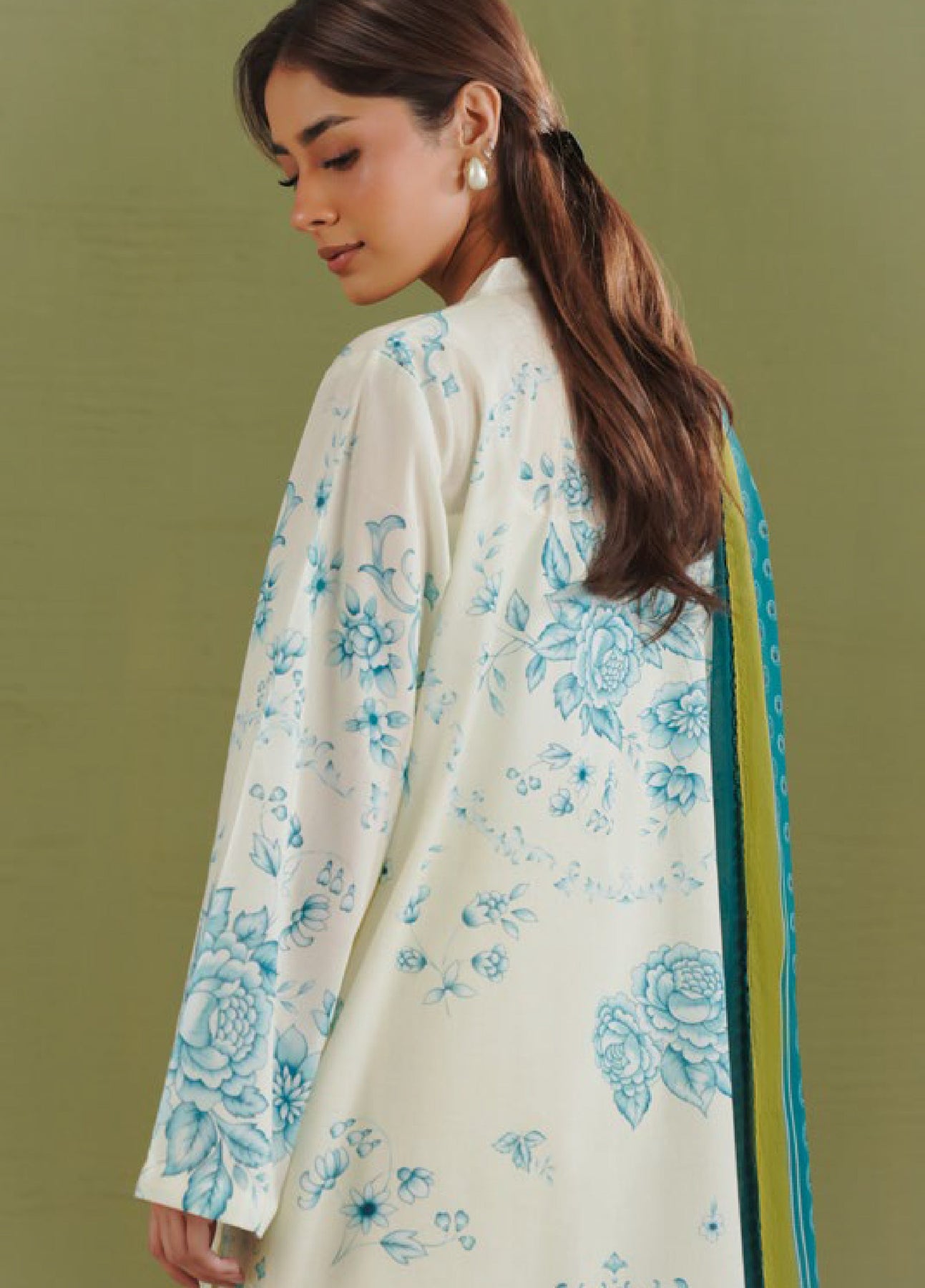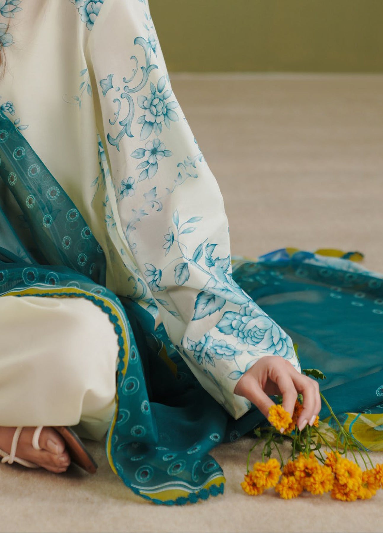 The dupatta is printed with polka dots and gara-inspired motifs in teal and olive green. The shirt showcases a blue gara floral print on an off-white base. The trouser is detailed with a blue gara floral border on off-white.