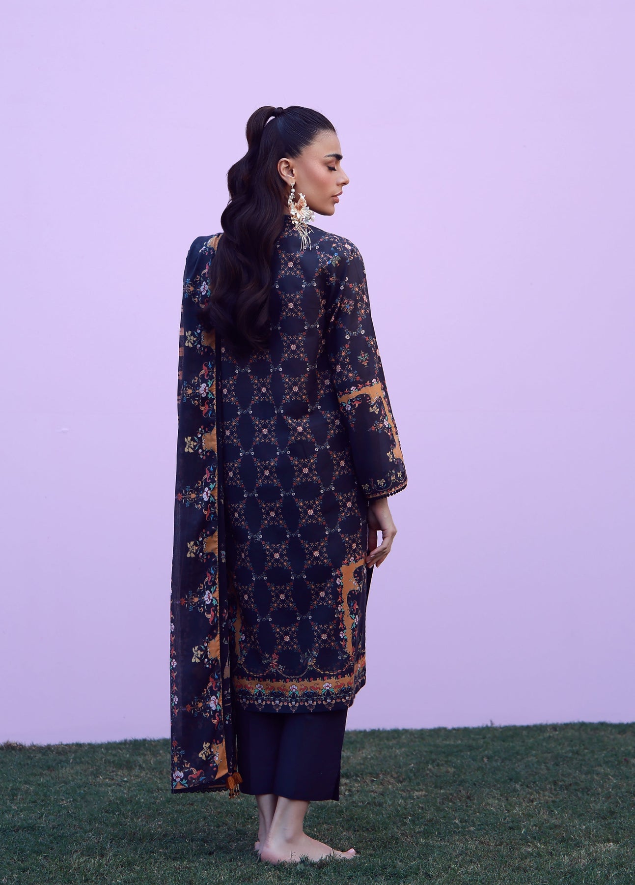 A black base adorned with intricate florals in warm rust and muted gold. The shirt pairs beautifully with classic trousers, while the dupatta echoes the print with graceful tasseled borders. A timeless composition rooted in heritage elegance.