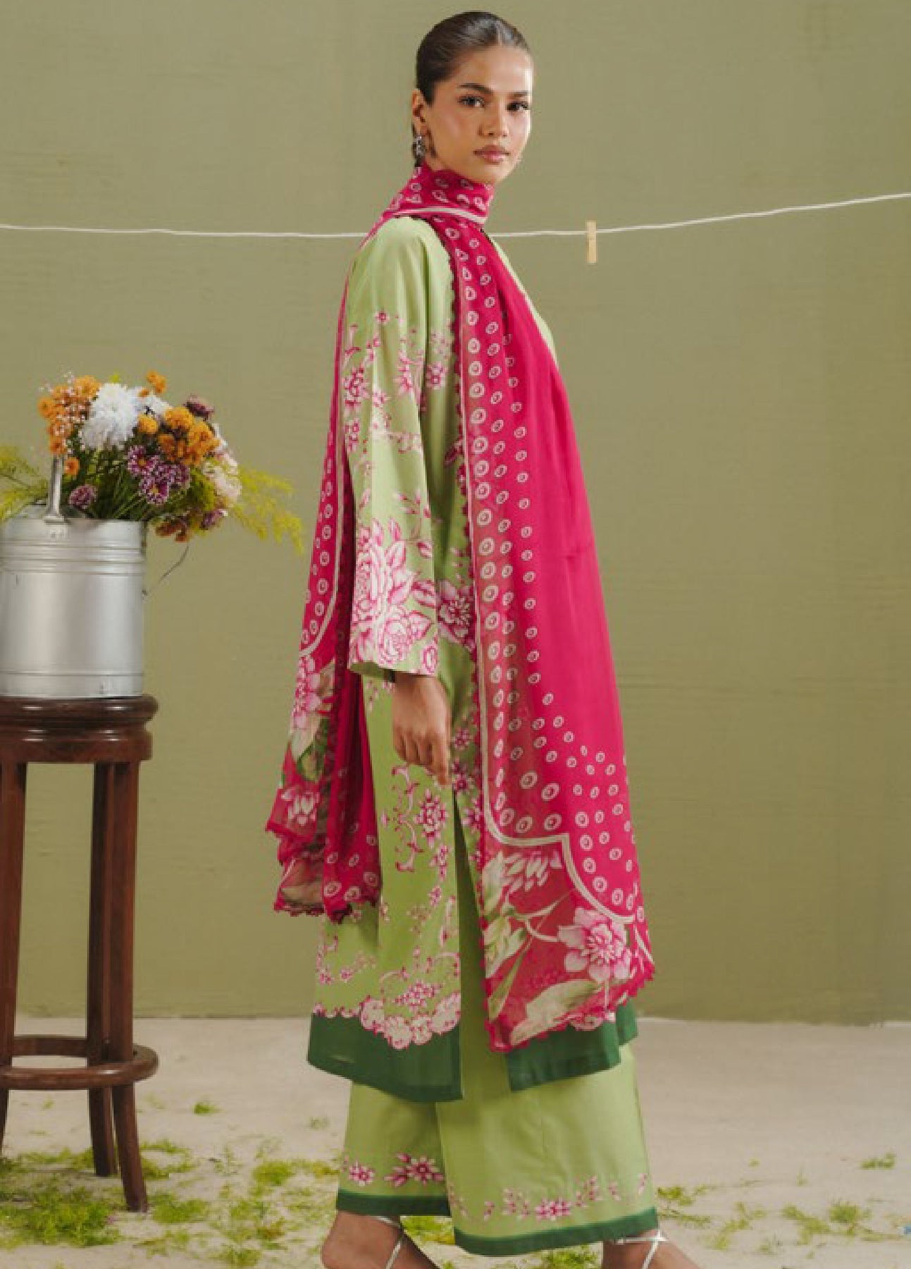 The dupatta features polka dots and gara-inspired detailing in hot pink. The shirt is printed with pink gara and floral motifs on a matcha base. The trouser is finished with a matching pink gara floral border on matcha.