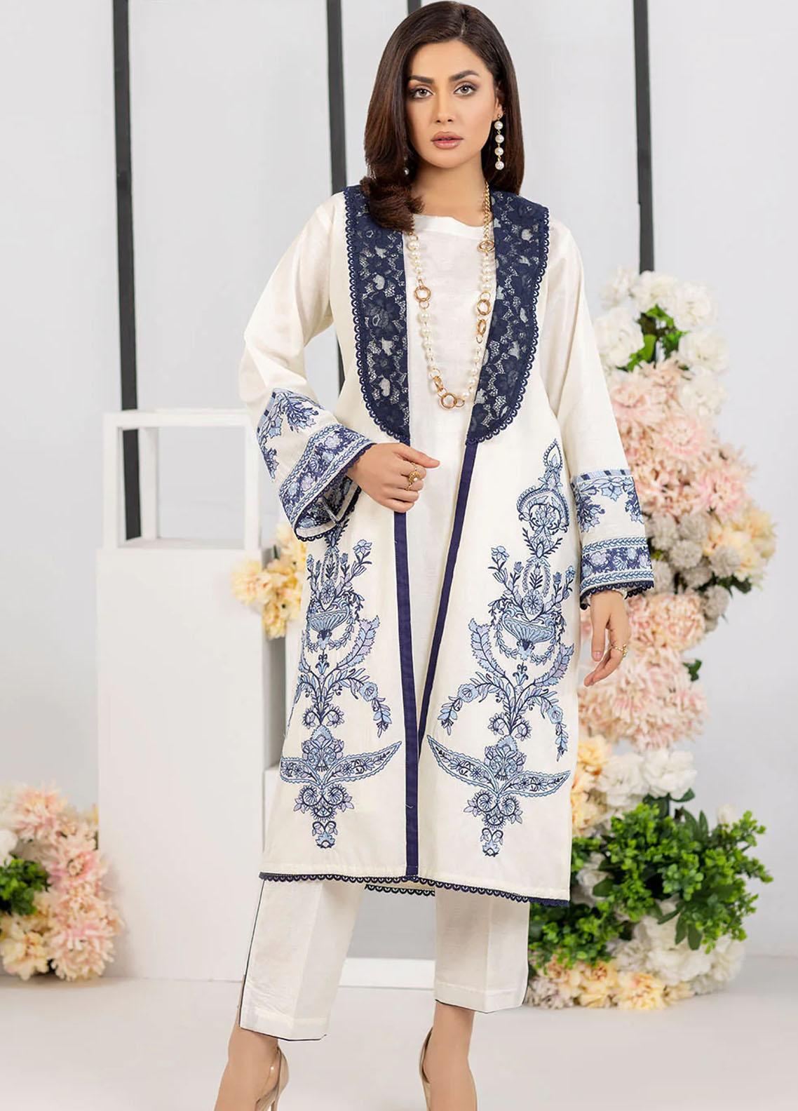 Straight front open gown with all over embroidery, embroidered sleeves and stylish neckline paired with matching undershirt and stylish trouser. lacing details on sleeves.