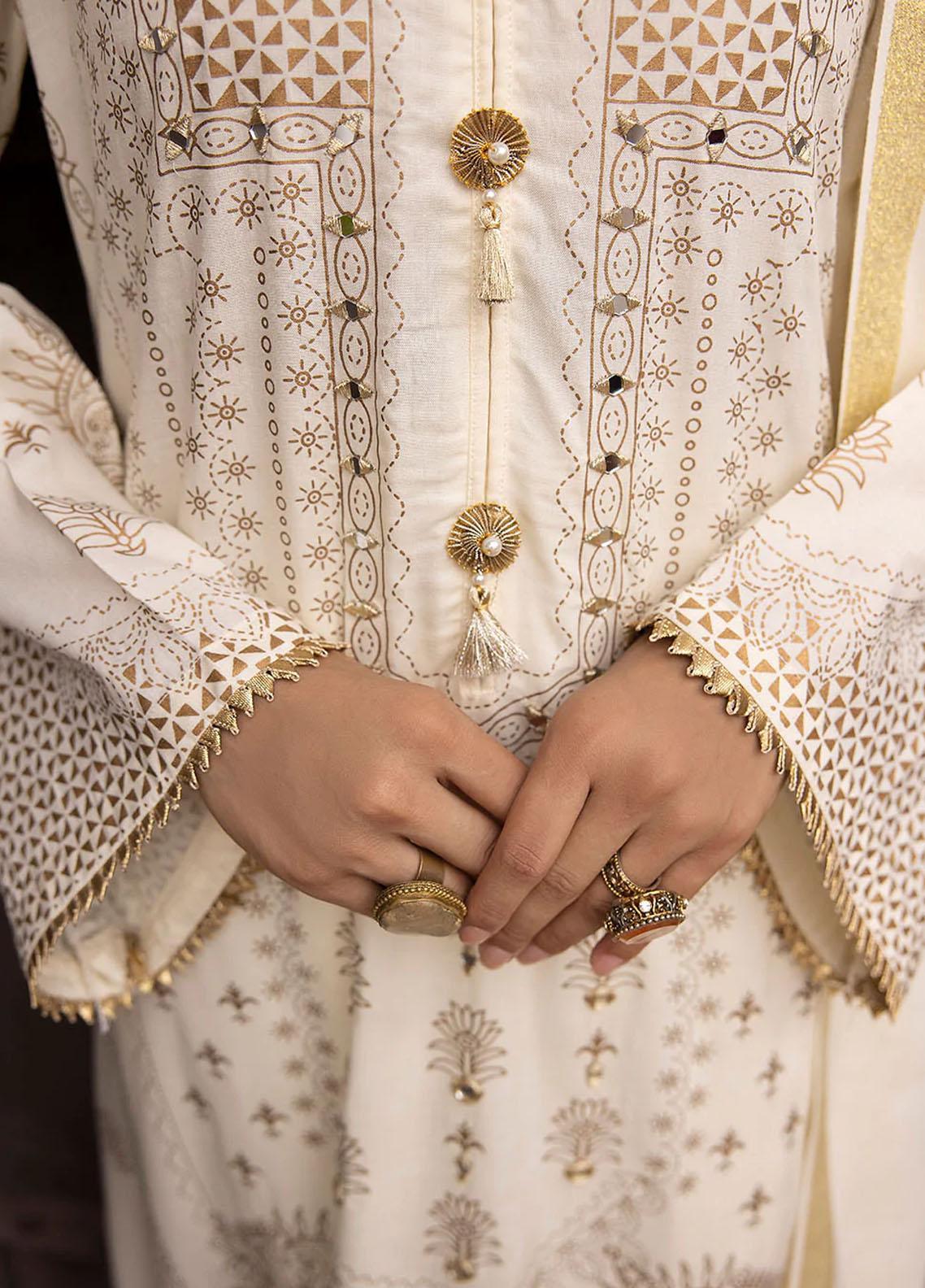Mirror embroidered and screen printed linen shirt styled with hand made buttons on neckline and lacing details on sleeves and daman.