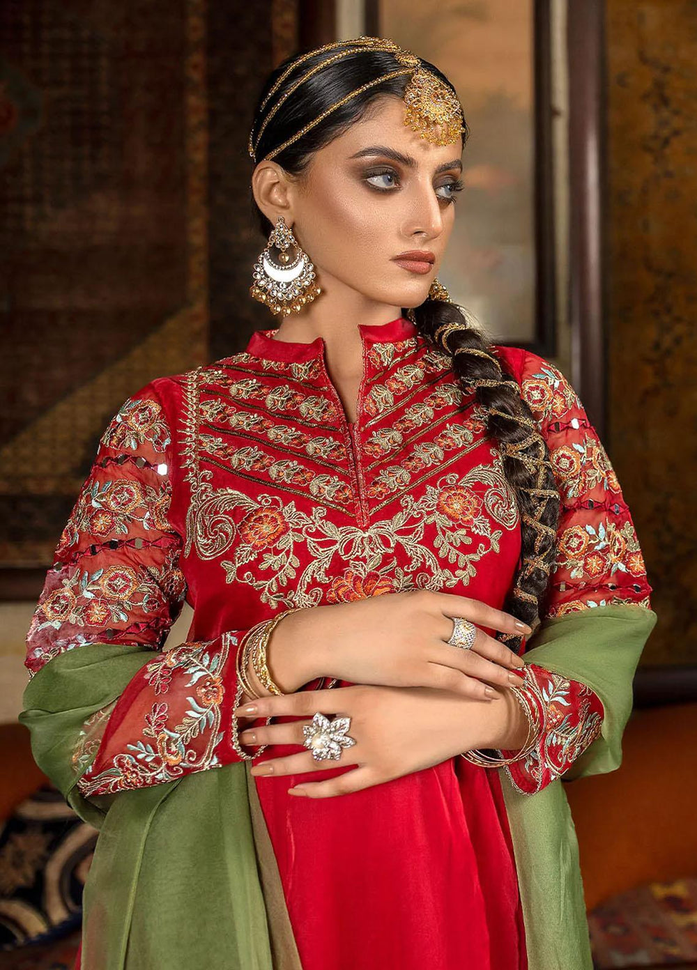 Embroidered organza frock styled with gota lace on neckline, Embroidered sleeves adorned with mirrors. Embroidered daman from front and back. The overall look is completed with tassels on daman and stylish hand made tassels on back.