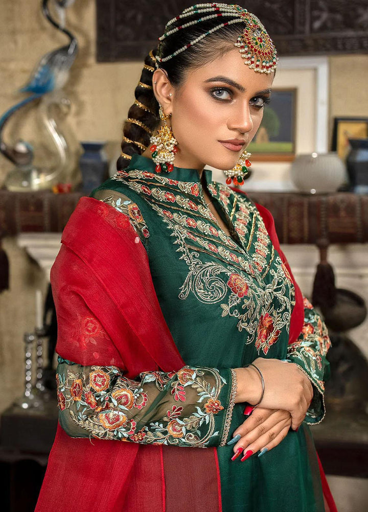 Embroidered organza frock styled with gota lace on neckline, Embroidered sleeves adorned with mirrors. Embroidered daman from front and back. The overall look is completed with tassels on daman and stylish hand made tassels on back.