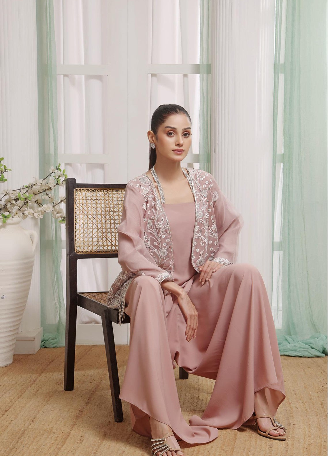 Redefine elegance with Velour Blush, a graceful blush-pink ensemble that fuses soft femininity with timeless sophistication. The outfit features a delicately embroidered organza top adorned with intricate white threadwork and beaded tassel detailing along the hem — paired with fluid leather georgette trousers and a matching inner.