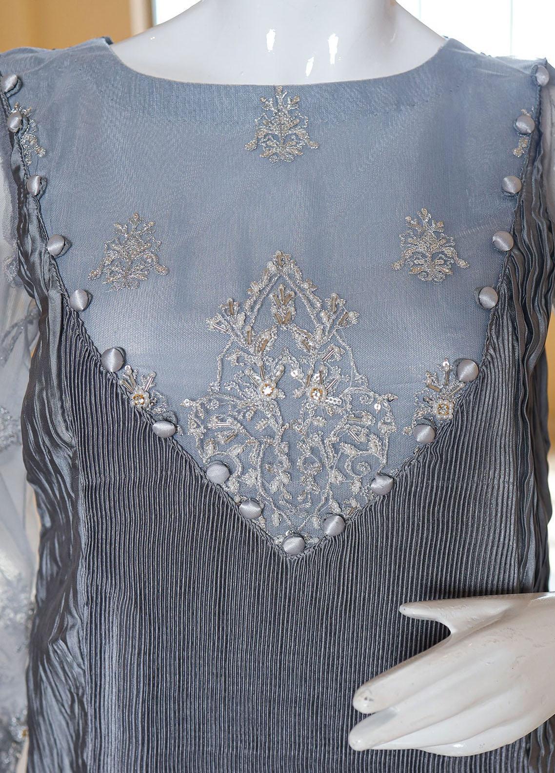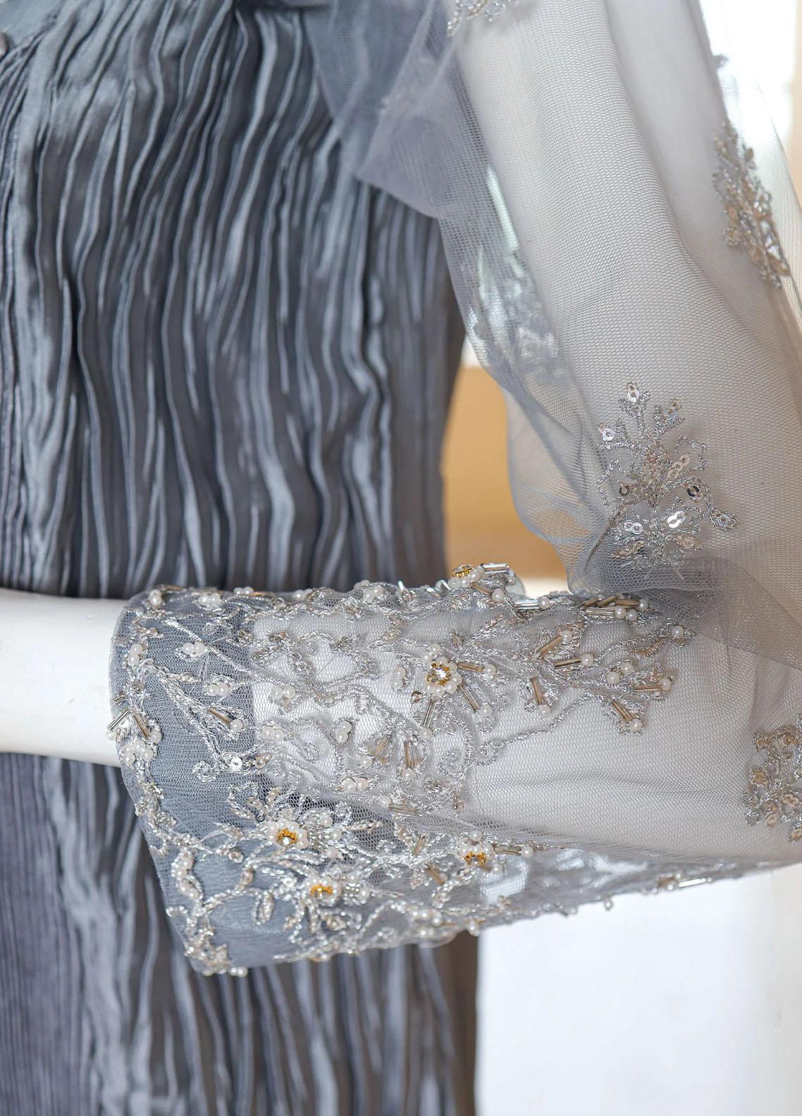The Design pattern is executed on a multi-hued pleated canvas with silver embroidery and adda work. The design is constructed on net and pleated fabric makes it perfect for every occasion.