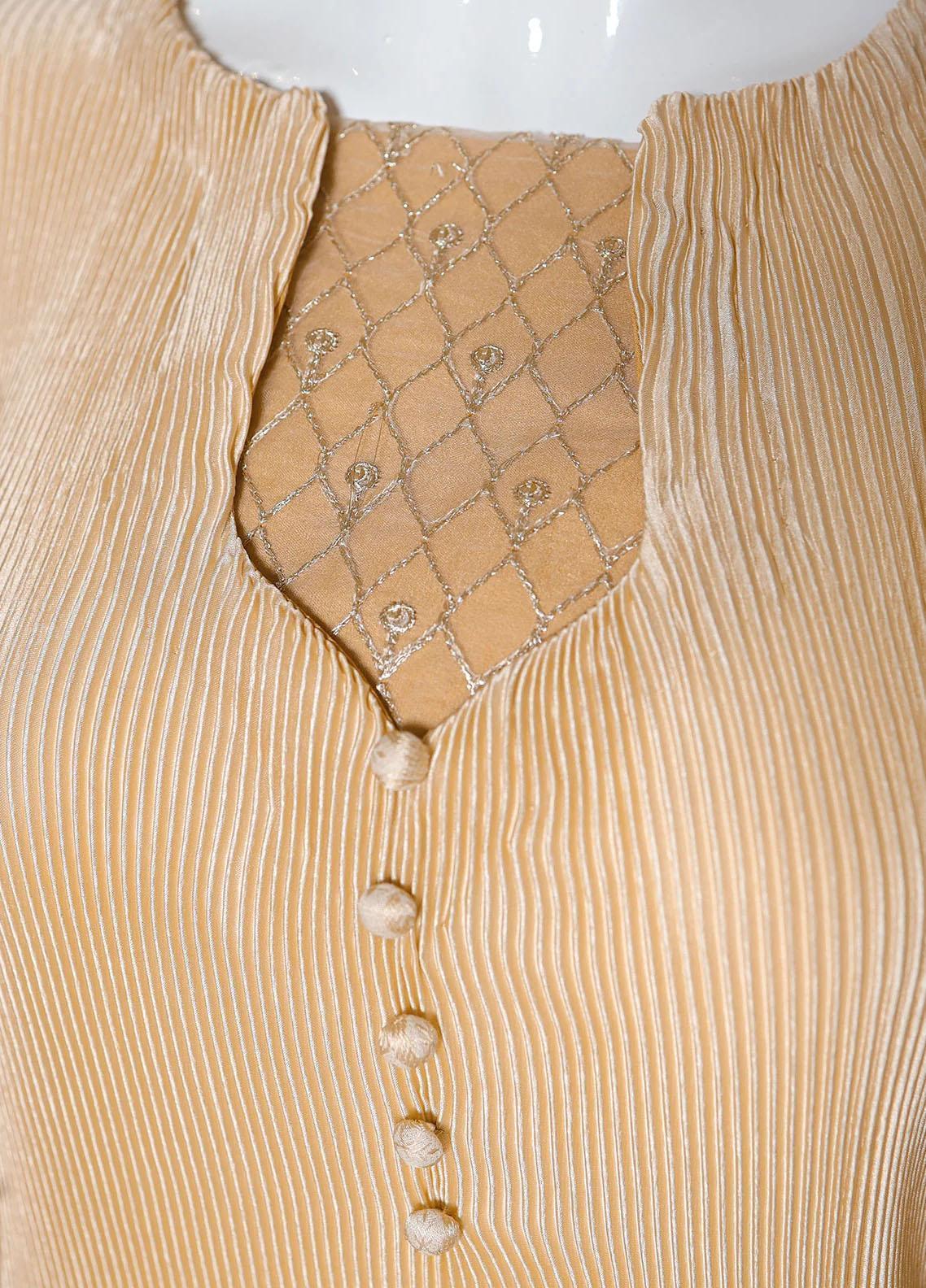 The Design pattern is executed on a beige canvas with combination of embroidered sleeves and borders. It features beautiful neckline with button details. The design is constructed on pleated fabric.