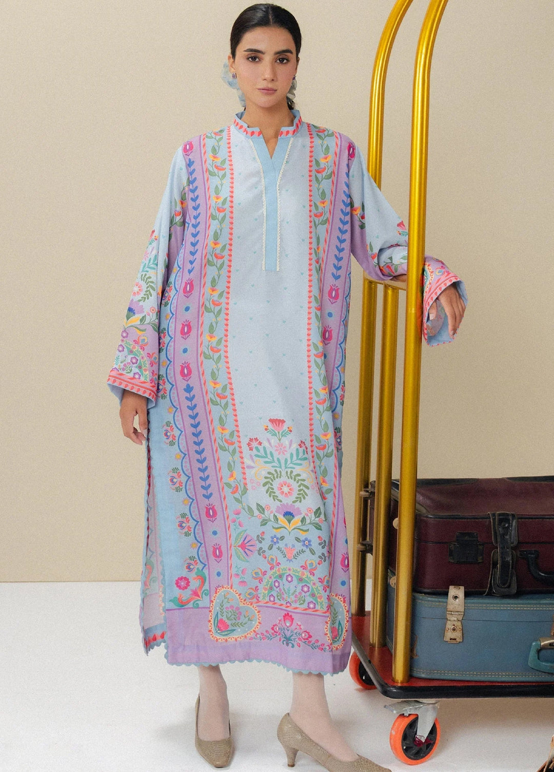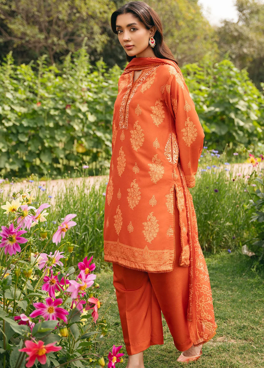 Marigold—a bright orange outfit. Made up of premium organza fabric with an embroidered front of the shirt paired with a plain shalwar and a block foil printed dupatta. The model paired it with a fawn and brown khussa, and she was looking absolutely adorable.