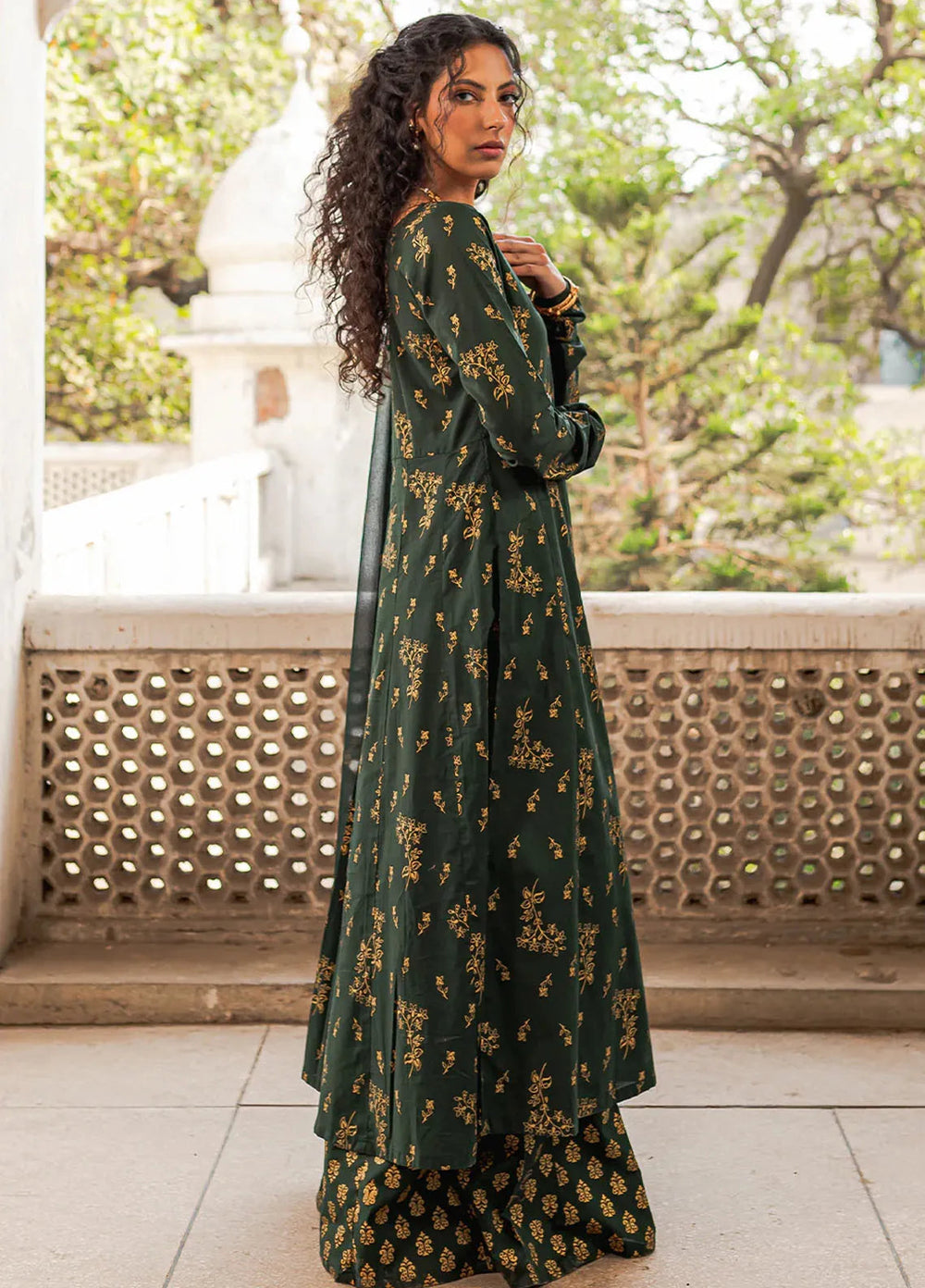 Marigold—a bright orange outfit. Made up of premium organza fabric with an embroidered front of the shirt paired with a plain shalwar and a block foil printed dupatta. The model paired it with a fawn and brown khussa, and she was looking absolutely adorable.