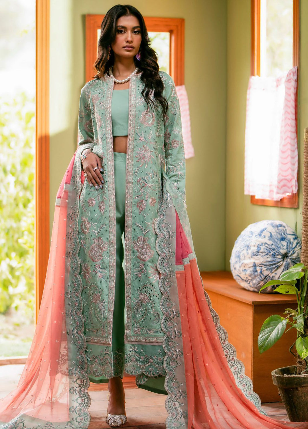 This is the ideal choice for girls to wear at their wedding and become the center of attention of the people at the event. This collection contains pure chiffon embroidered front and back, embroidered sleeves, a net lengha with embroidery over it, an embroidered chiffon dupatta, and an embroidered palu border with lining.