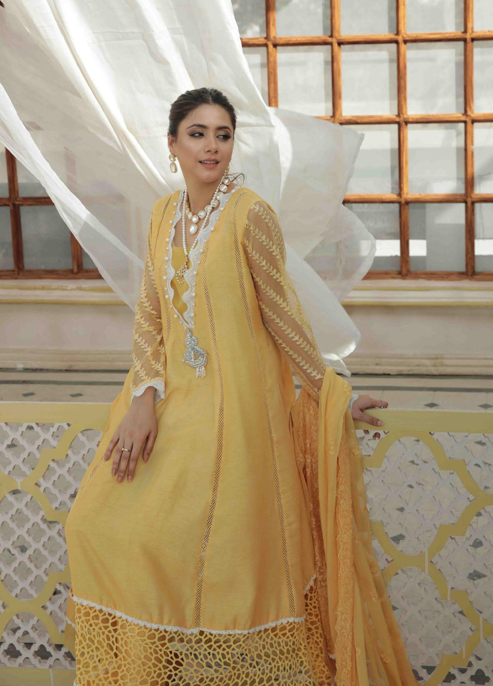 The brand launched MahPari Volume 1 as a ready to wear 3 piece collection having six evenly unique designs. Each telling a different story. Nurten; a pearl white royal outfit, embellished with floral embroidery and paired with a two-pastel shaded screen printed dupatta. If you’re looking for a perfect summery outfit then Elnara is the choice for you. A lime green outfit with a fresh in needle textured lawn fabric, keeping you cool and comfy. Coming with self-toned classic embroidery with cut-work laces. Paired with embroidered dupatta and cotton pants. The MahPari story does not end here, there is a treat for black lovers also. Aysel, a jet black outfit mold over premium lawn fabric. Having contrasting embroideries, distinguished laces paired with olive green organza dupatta with 3 colored screen printing that gives the dress an overall delicate look.