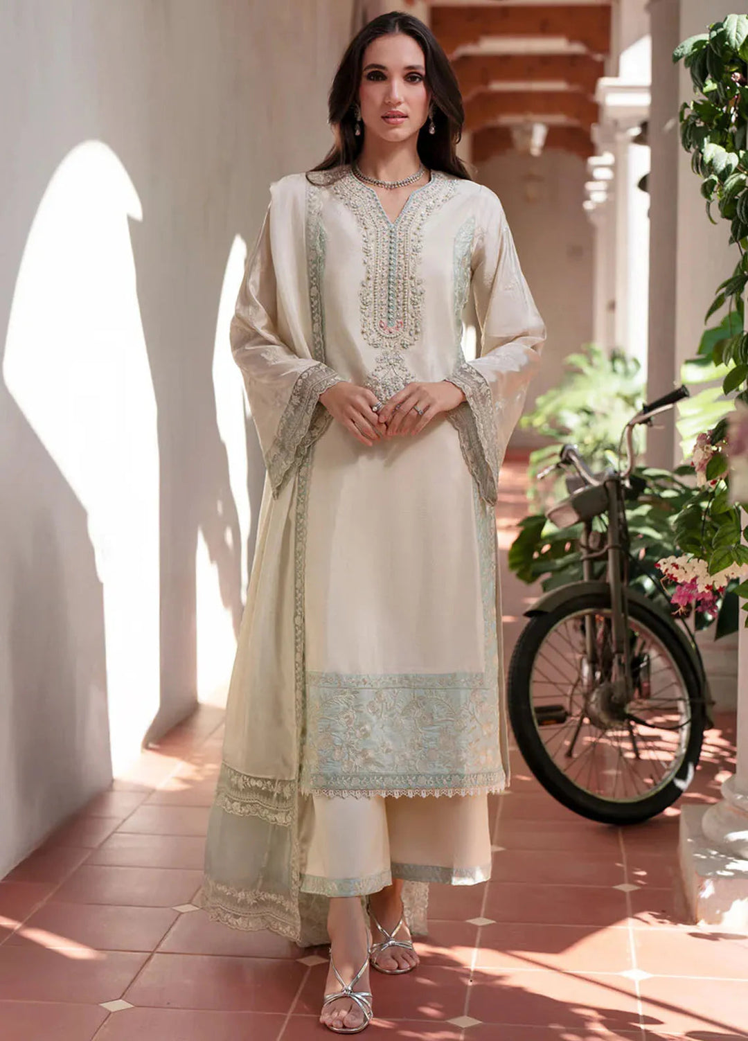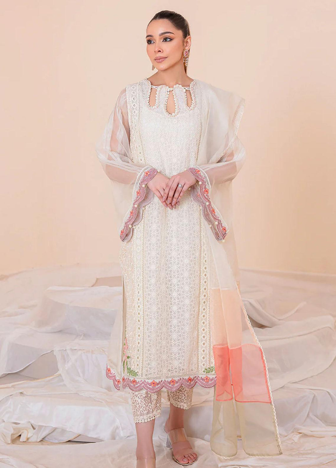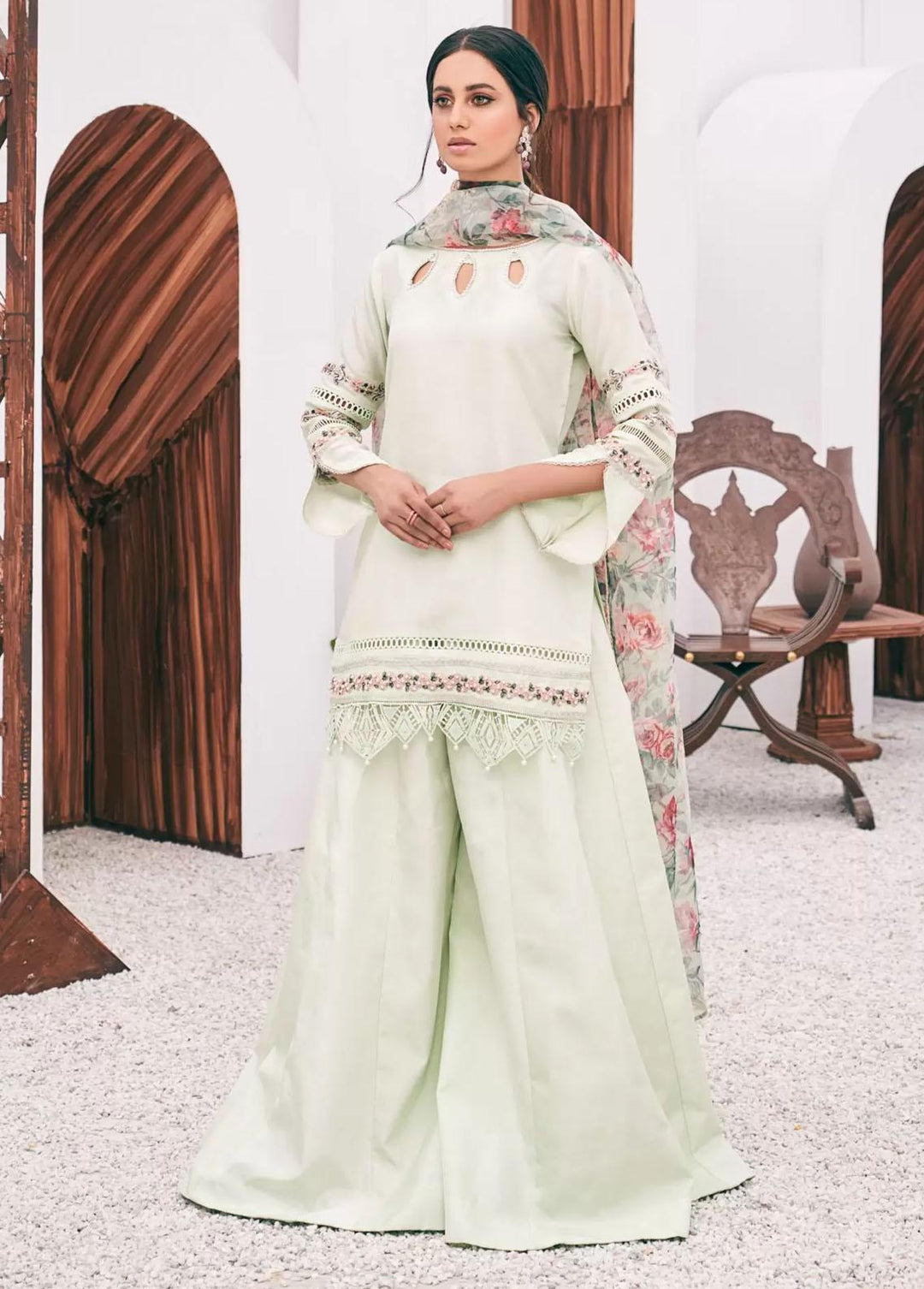 We all are pretty aware of the summer stories of Pakistan. As the heat rises, the need for having a cool summer outfit also spikes. MahPari takes the lead here as well. The versatile collection does not miss the summer fashion needs. The cool and comfy fabric in which MahPari comes in is all what you need in the sweltering summer of Pakistan. Let me help you find the best outfits for summers from the MahPari Luxury Pret Collection. On top of the list, I would like to put “Irmak”. The signature design of this collection comes with cool tones of lavender embroidered over checkered woven lawn that adds even more charm to the ensemble. Second, “Inara”. An outfit in a fresh summer colored lawn with a hint of pink. Paired with a screen printed organza dupatta and sharara pants, giving the dress a classic look and a comfy feel, making it just right for the summer season.