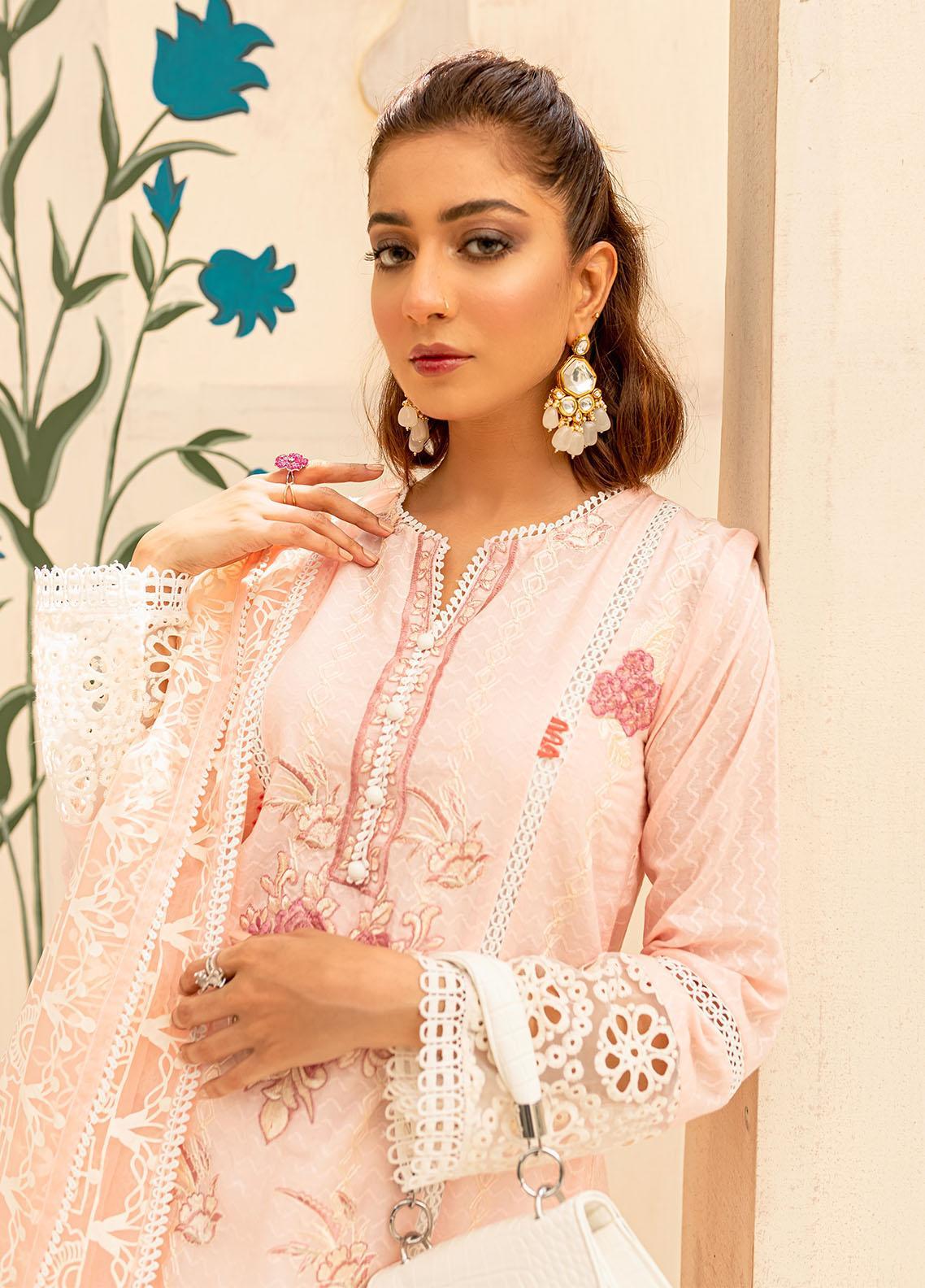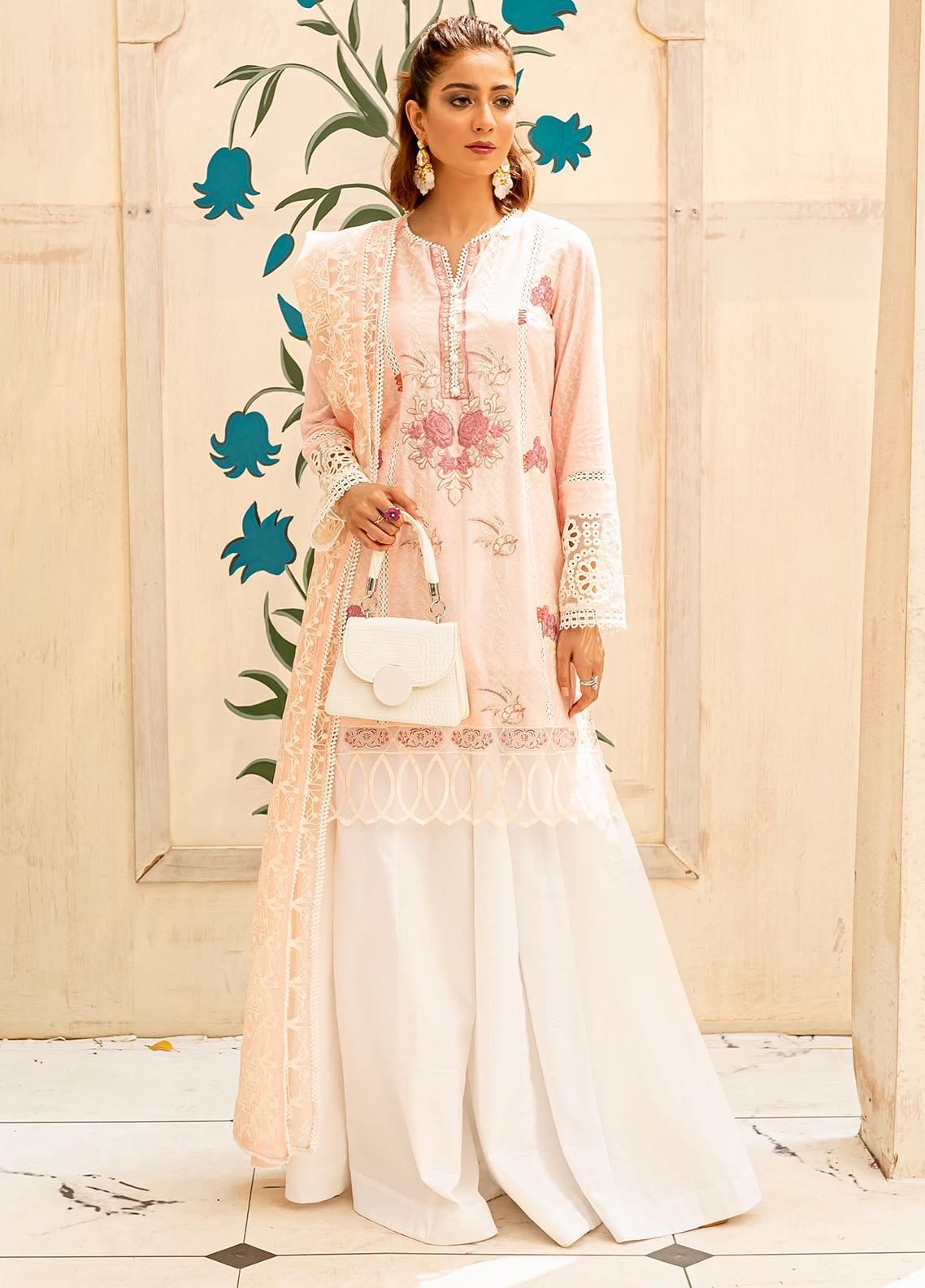 A fresh summer colored lawn with pastel shades embroidery and hint of pink. A classic look with sharara pants make this outfit more elegant. Paired with screen printed organza dupatta.