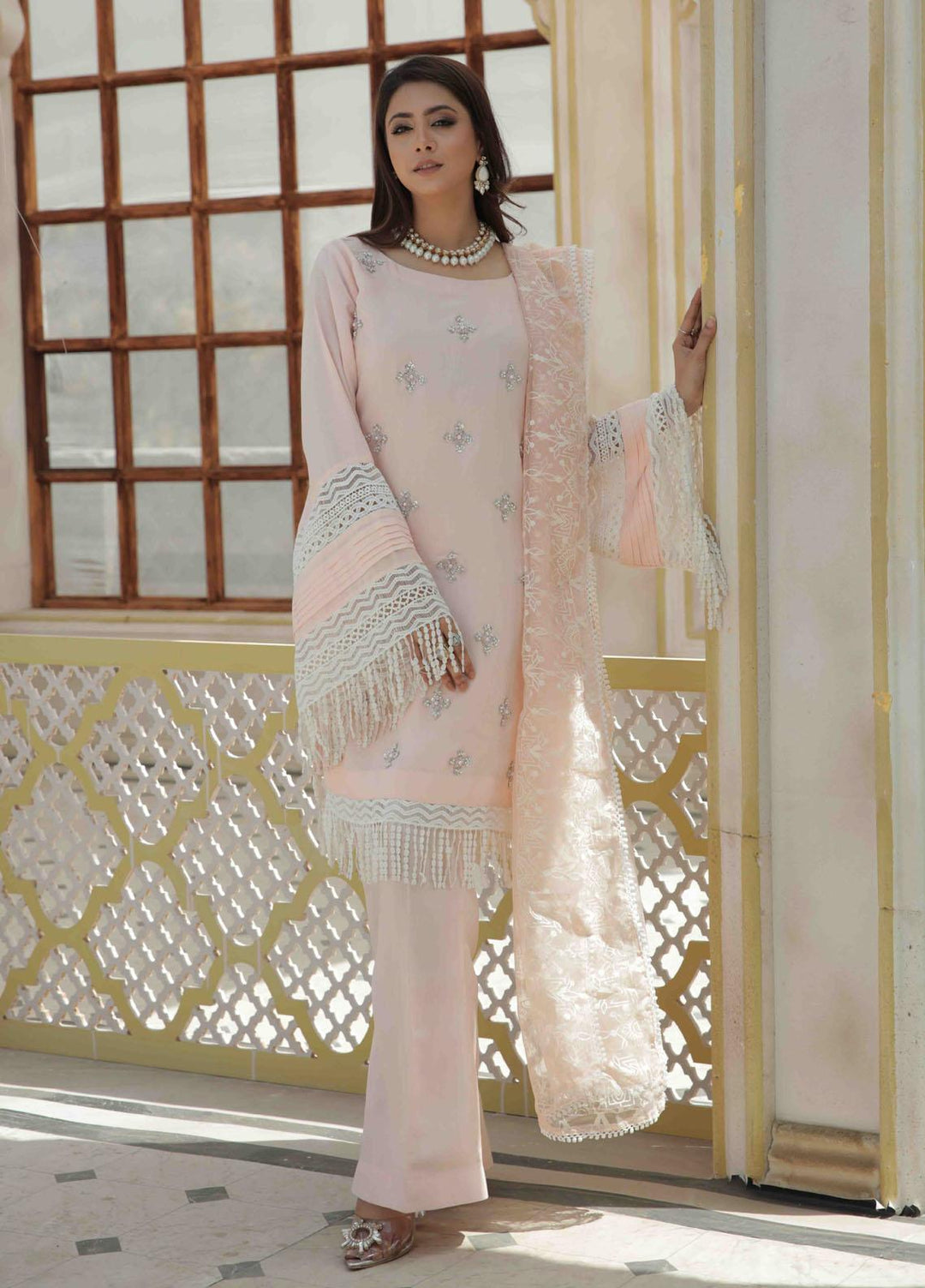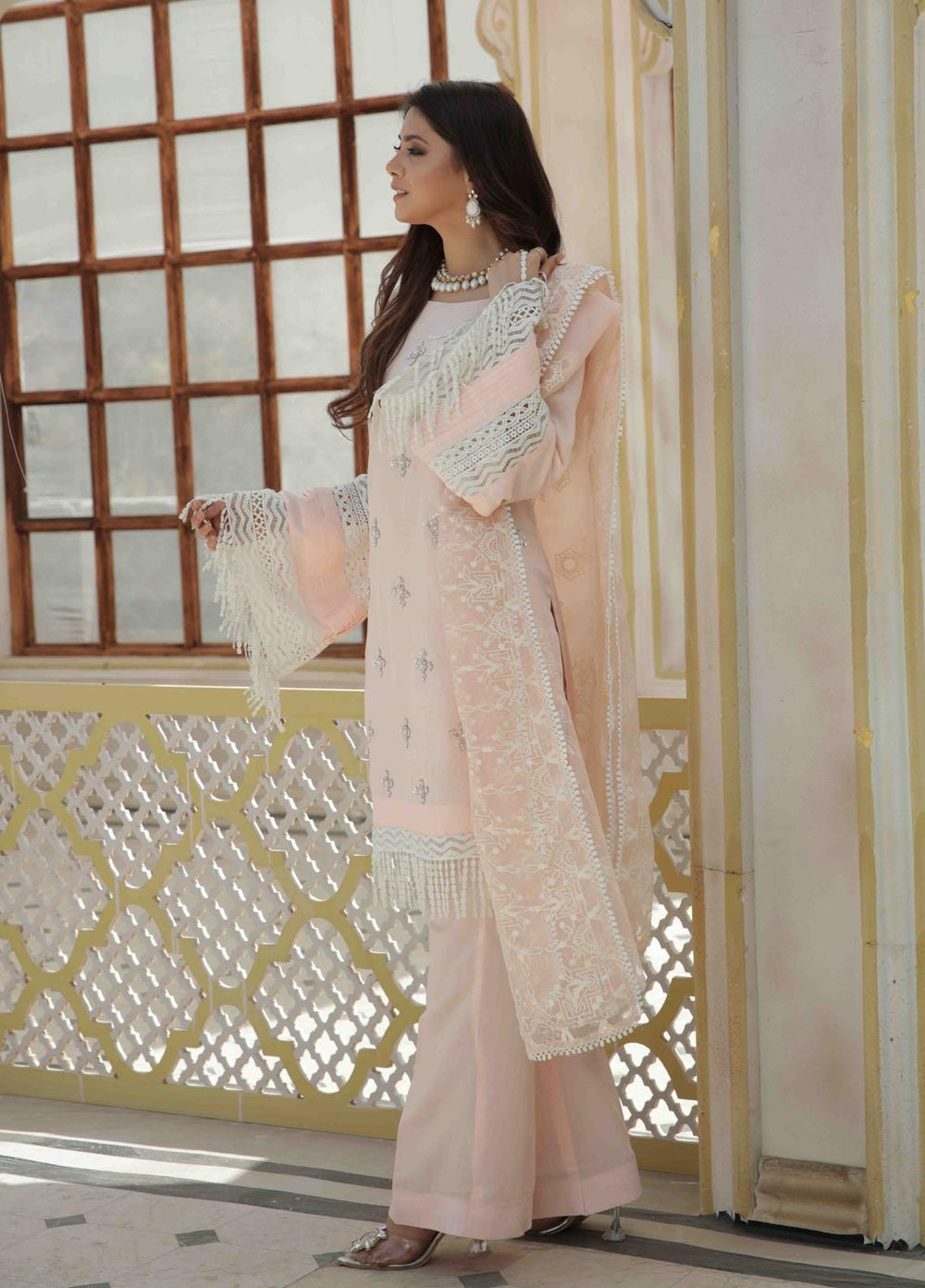We all are pretty aware of the summer stories of Pakistan. As the heat rises, the need for having a cool summer outfit also spikes. MahPari takes the lead here as well. The versatile collection does not miss the summer fashion needs. The cool and comfy fabric in which MahPari comes in is all what you need in the sweltering summer of Pakistan. Let me help you find the best outfits for summers from the MahPari Luxury Pret Collection. On top of the list, I would like to put “Irmak”. The signature design of this collection comes with cool tones of lavender embroidered over checkered woven lawn that adds even more charm to the ensemble. Second, “Inara”. An outfit in a fresh summer colored lawn with a hint of pink. Paired with a screen printed organza dupatta and sharara pants, giving the dress a classic look and a comfy feel, making it just right for the summer season.