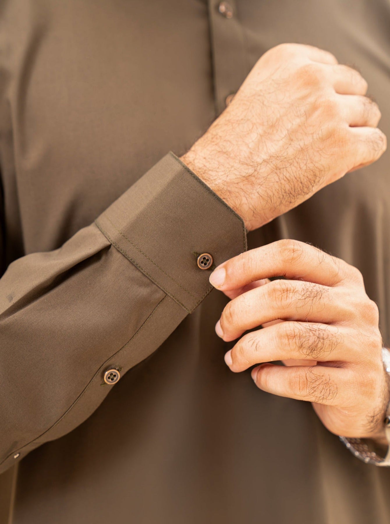 Enhance Your Look With The Olive Green French Collar Shalwar Kameez, Designed For A Timeless Classic Fit And Stylish Appeal.