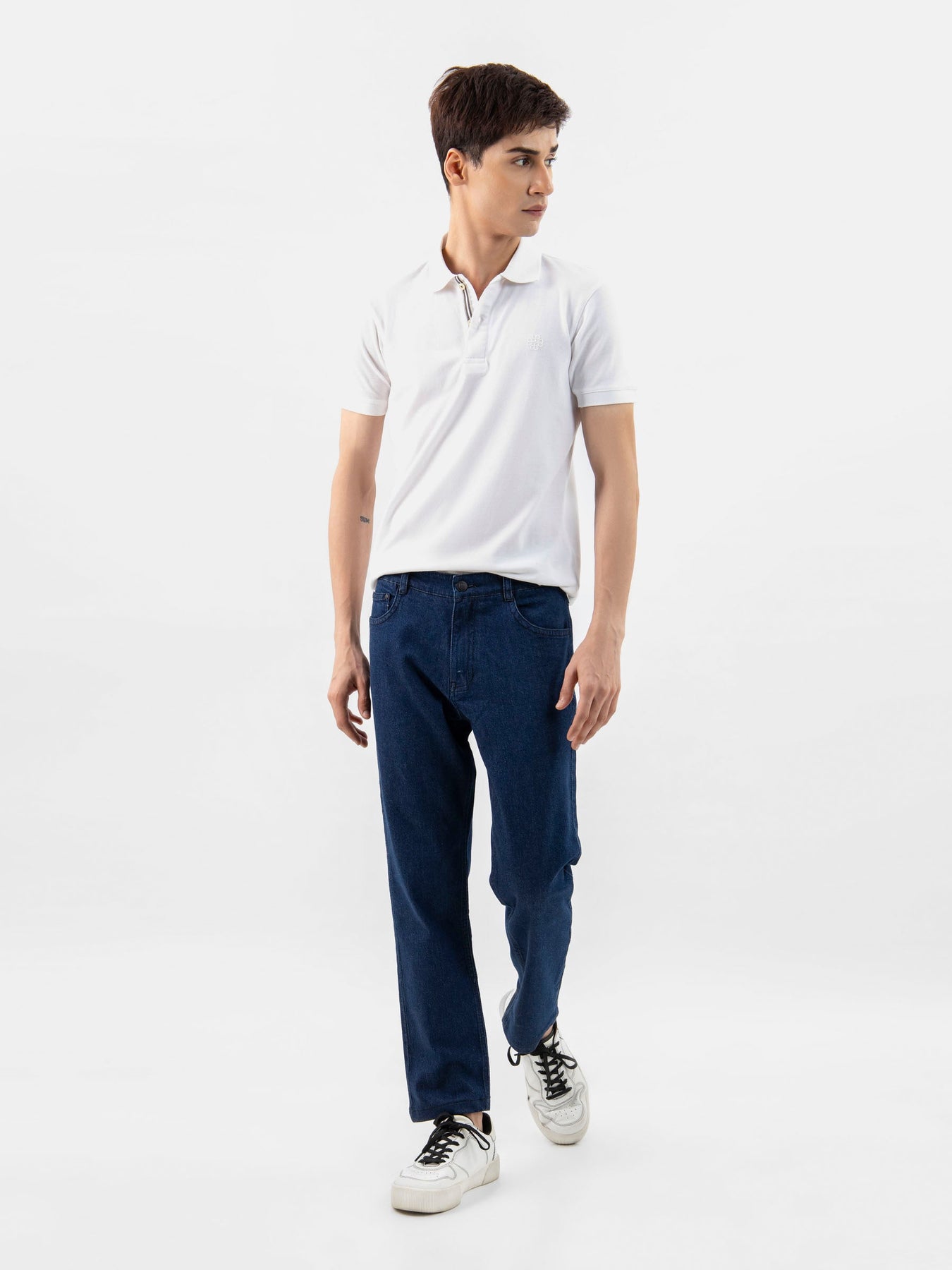 This five-pocket denim serves as the ideal foundation for any cool outfit. Washed for a classic blue indigo color, this denim features leather patch at the back. Zip up fly, branded metal rivets & button completes the look of this denim.