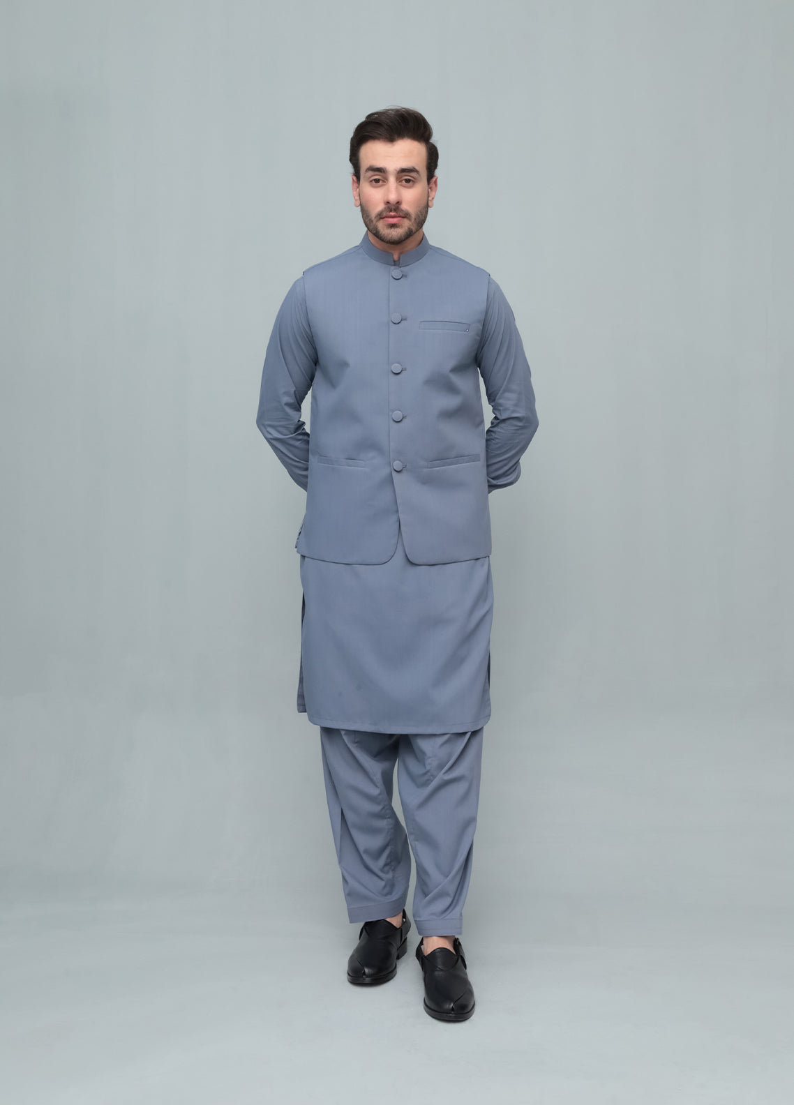 Enhance Your Style With The Bluish Gray With Blended Waistcoat - Round Cut & Matching Fabric Buttons - Men — A timeless blend of tradition and modern elegance. Featuring a round cut waistcoat, this ensemble is perfect for formal events and cultural occasions.