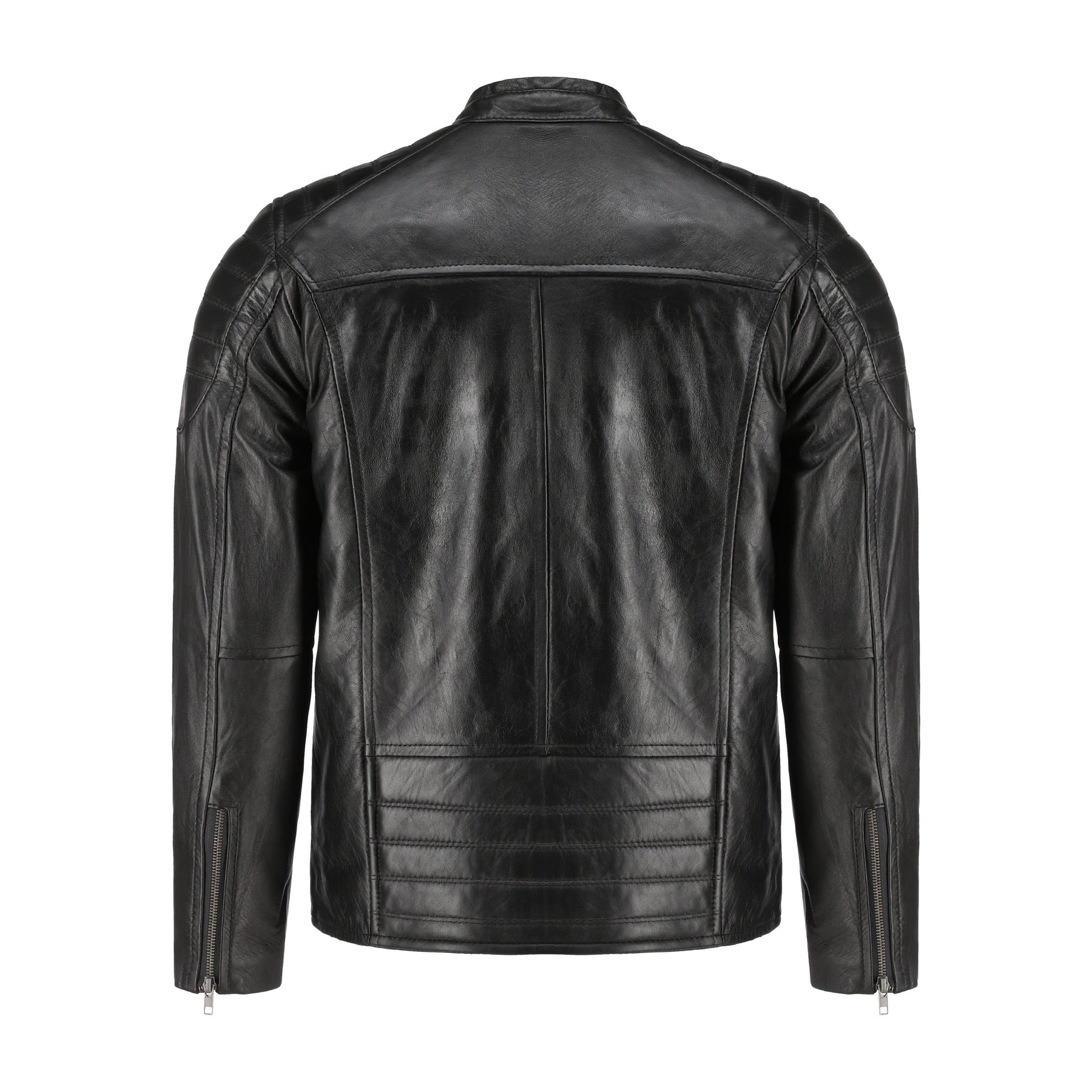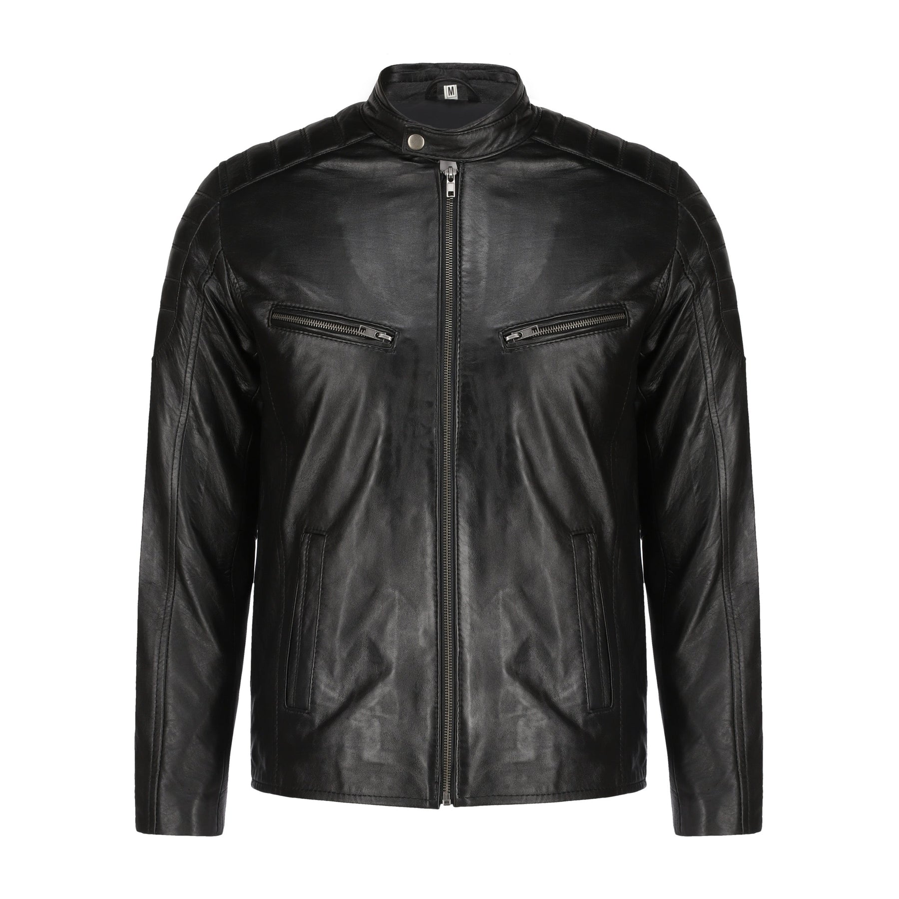 This black lambskin leather jacket is an ultimate trendsetter. It comes with a simple and classy design and features, front zip fastener, front zip pockets, snap button collar, and a modern fit.