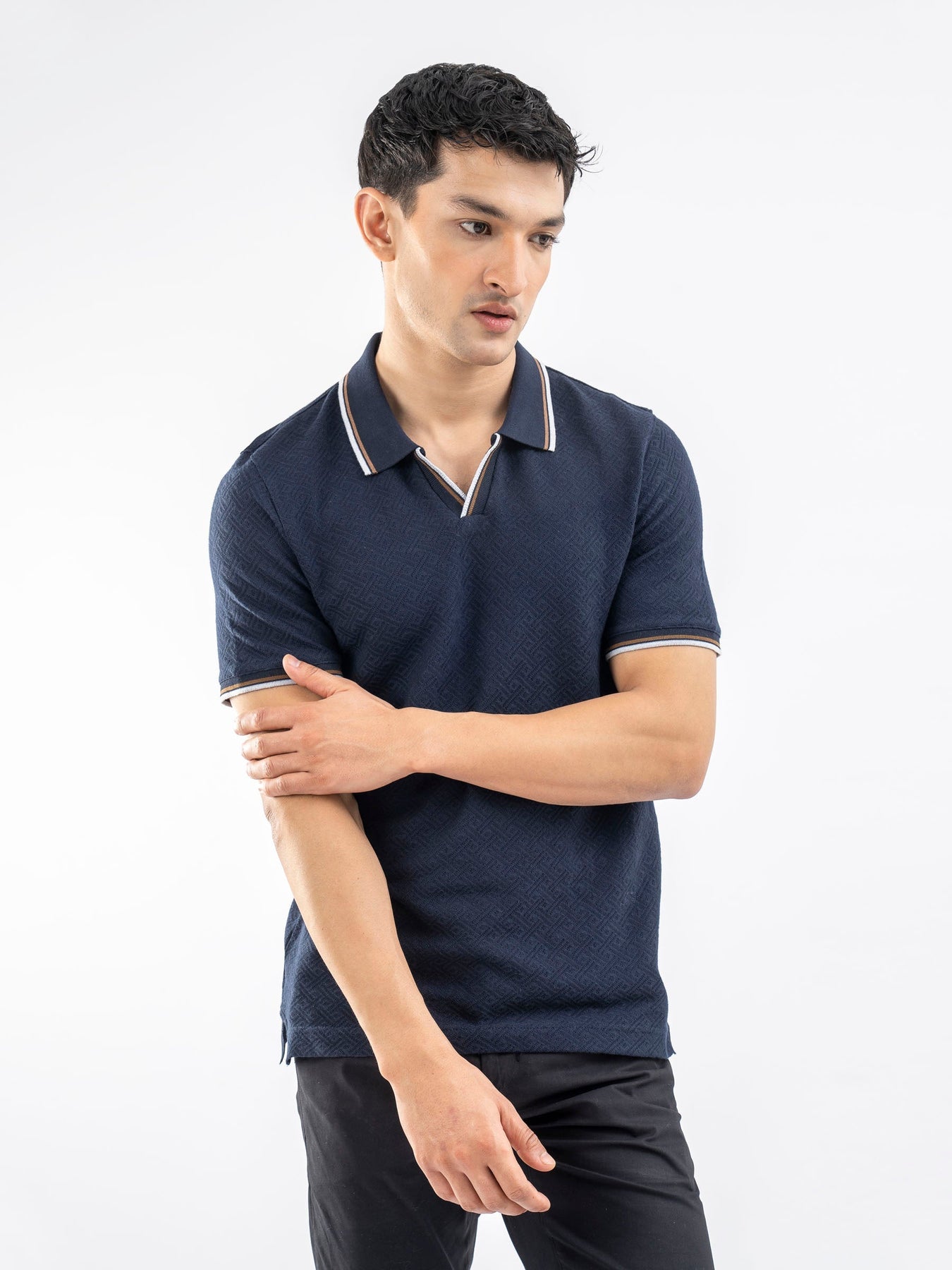 Elevate your casual style with this navy blue jacquard structured tipped v-neck polo. Featuring a refined jacquard texture, contrast tipping on the collar and sleeves, and a modern V-neck design, this polo blends comfort with a touch of polish—perfect for smart-casual days.