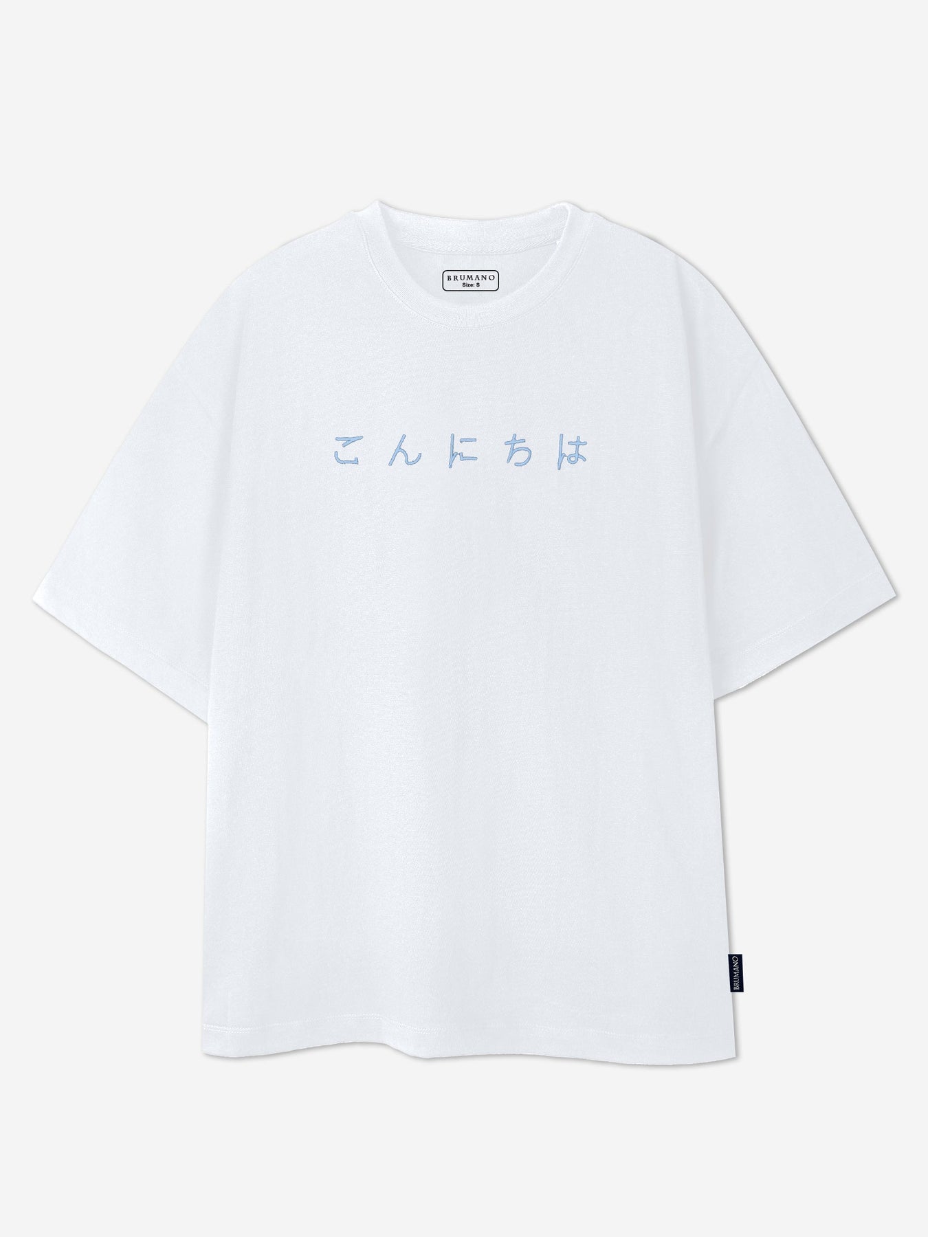 Elevate your everyday look with this white oversized t-shirt featuring minimalist Japanese embroidery 'Hello'. Crafted from soft, breathable cotton, it offers a relaxed shoulder drop fit and subtle style perfect for modern streetwear look