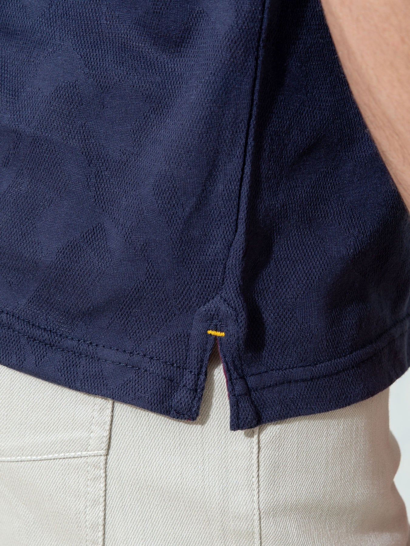 Elevate your casual style with this navy blue mercerized polo shirt, made with jacquard patterned knitted fabric. Featuring maroon inner collar detailing. Perfect for day out or a day at the office.