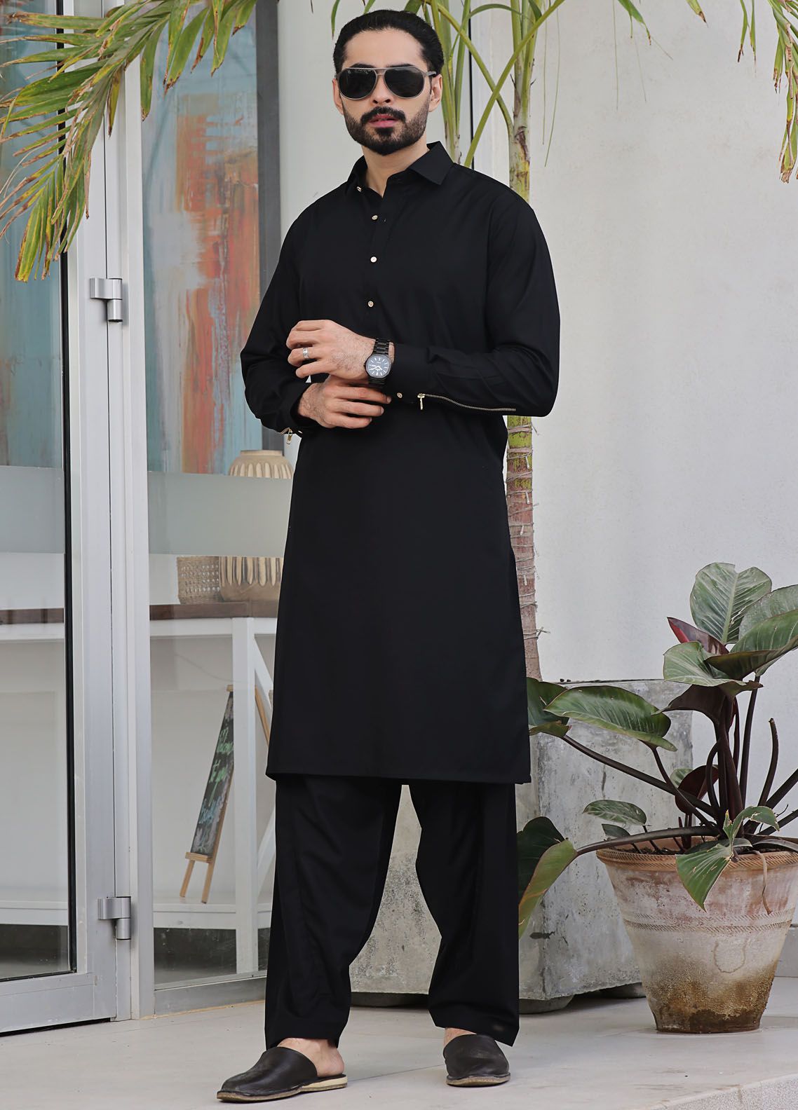 Mens Formal Designer Shirt Collar Shalwar Kameez with Fancy Zip on Sleeves