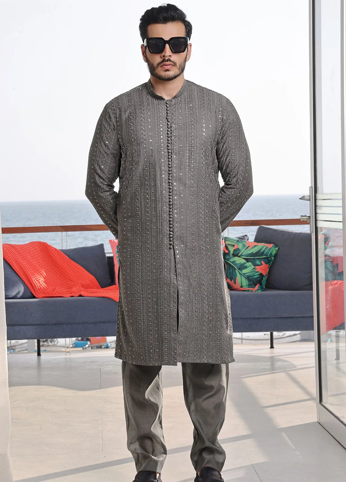 Mens Formal Embroidered Front Open Raw Silk Kurta Pyjama
