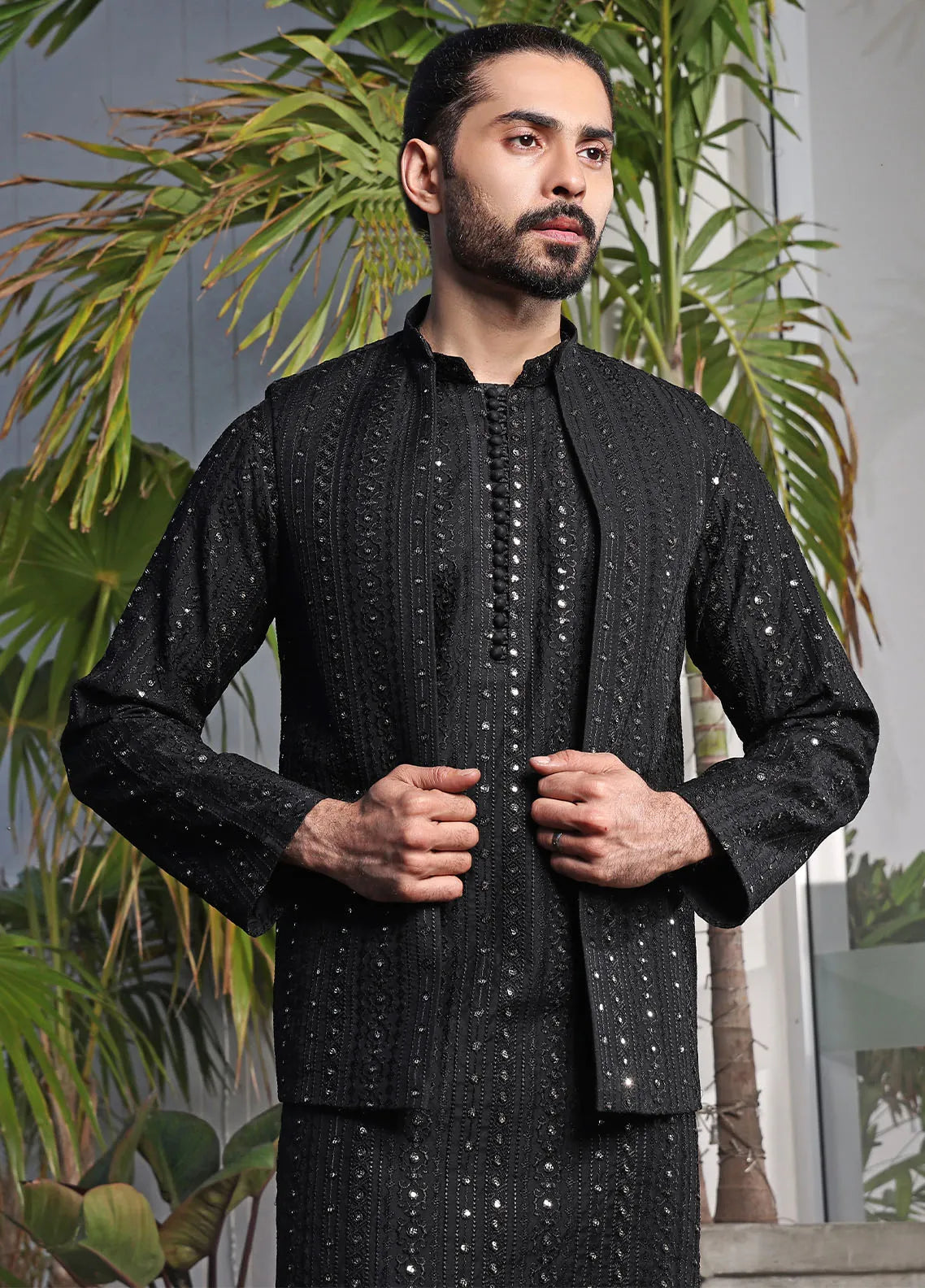 Mens Formal Designer Sequence Work Kurta Pyjama with Embroidery Paired with Matching Waistcoat