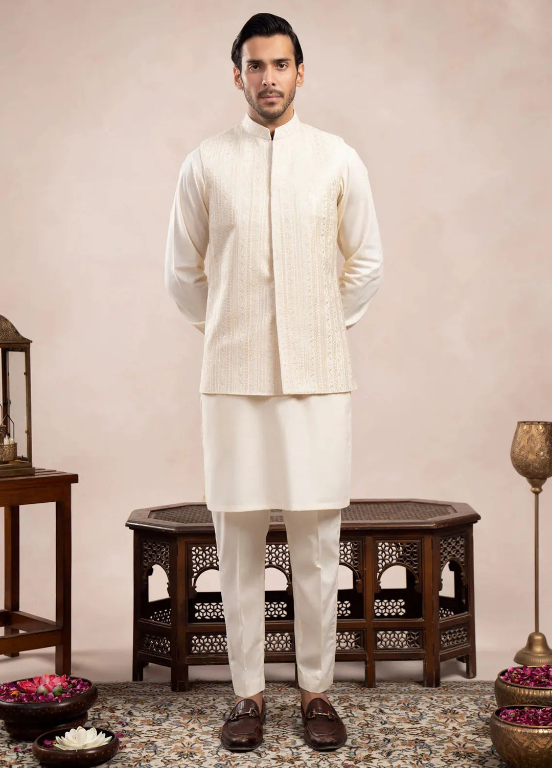 Muraqsh Bosky White Kurta Shalwar with Camel Suiting Waistcoat Straight Cut