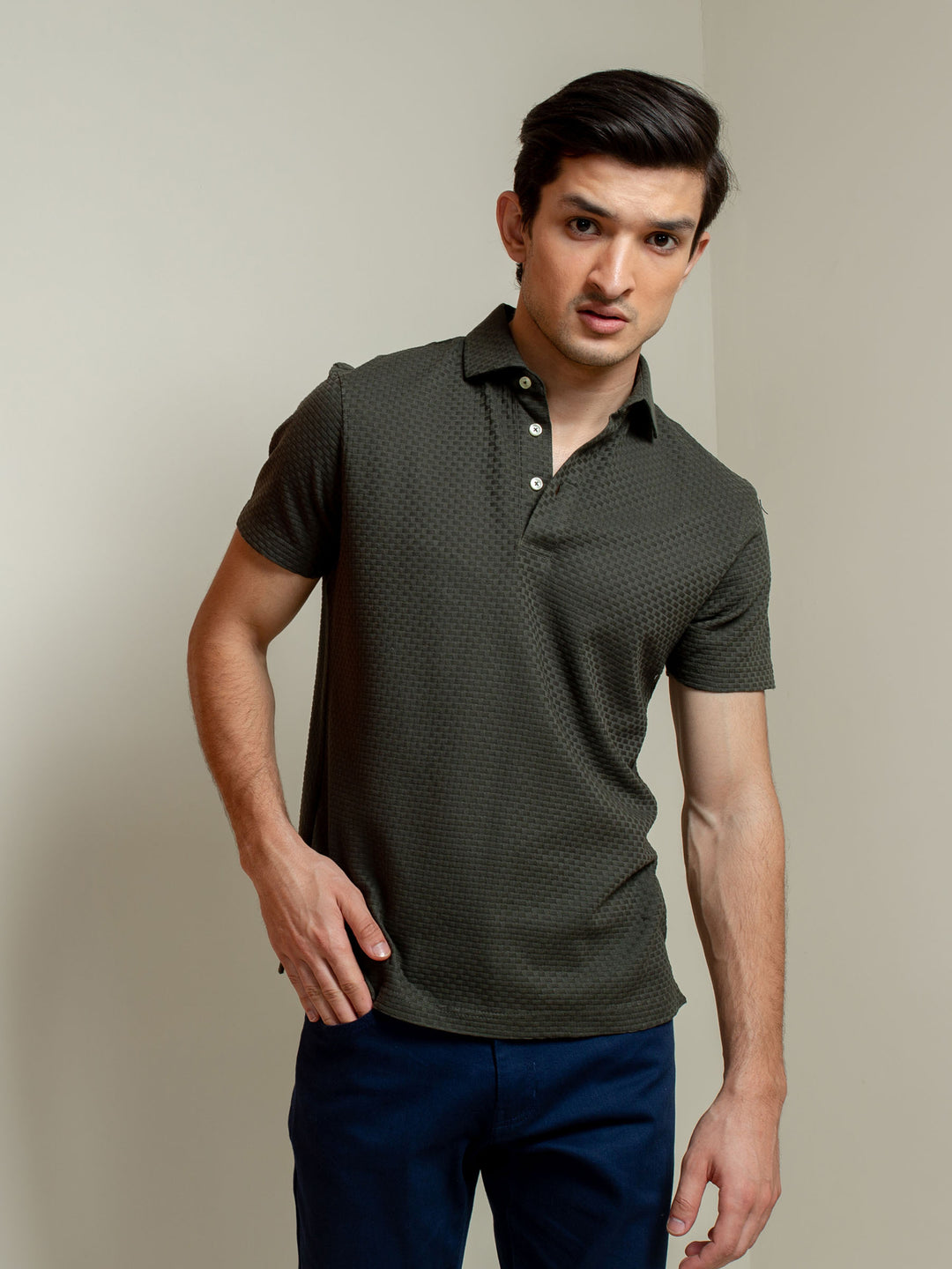 Brumano Solids Cotton Polo Olive Textured Polo With Classic Collar