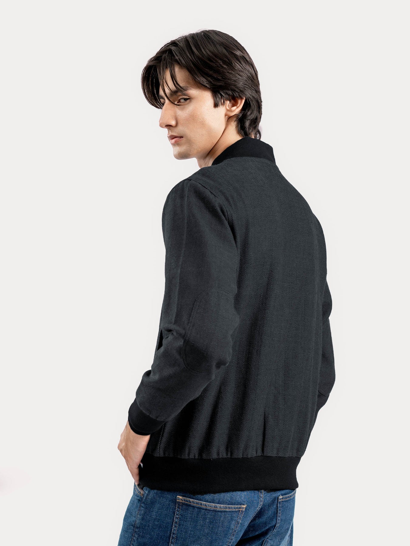 Elevate your casual look with this grey herringbone bomber jacket. Made from indigo-dyed fabric in a herringbone weave. This modern jacket features bomber collar & the same fabric elbow patch for a casual touch. Perfetct for layering over tees or jumpers