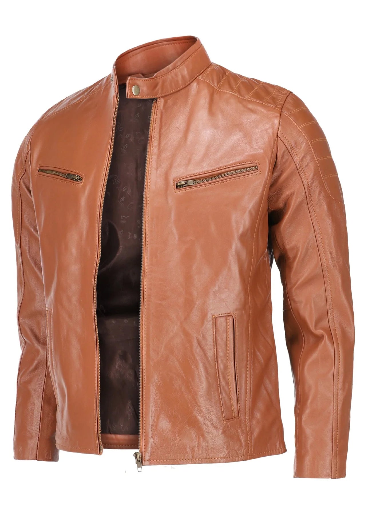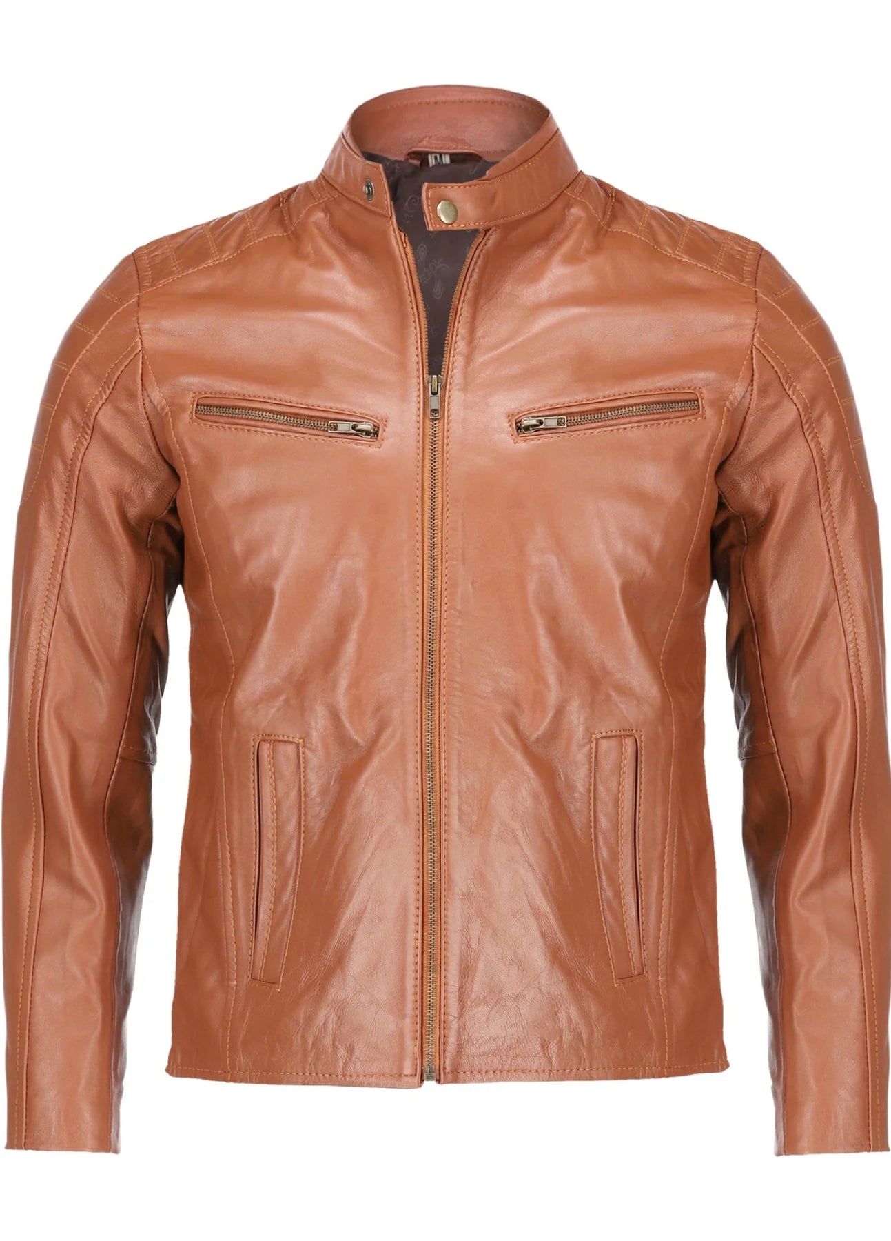 This Tan lambskin leather jacket is an ultimate trendsetter. It comes with a simple and classy design and features, front zip fastener, front zip pockets, snap button collar, and a modern fit.