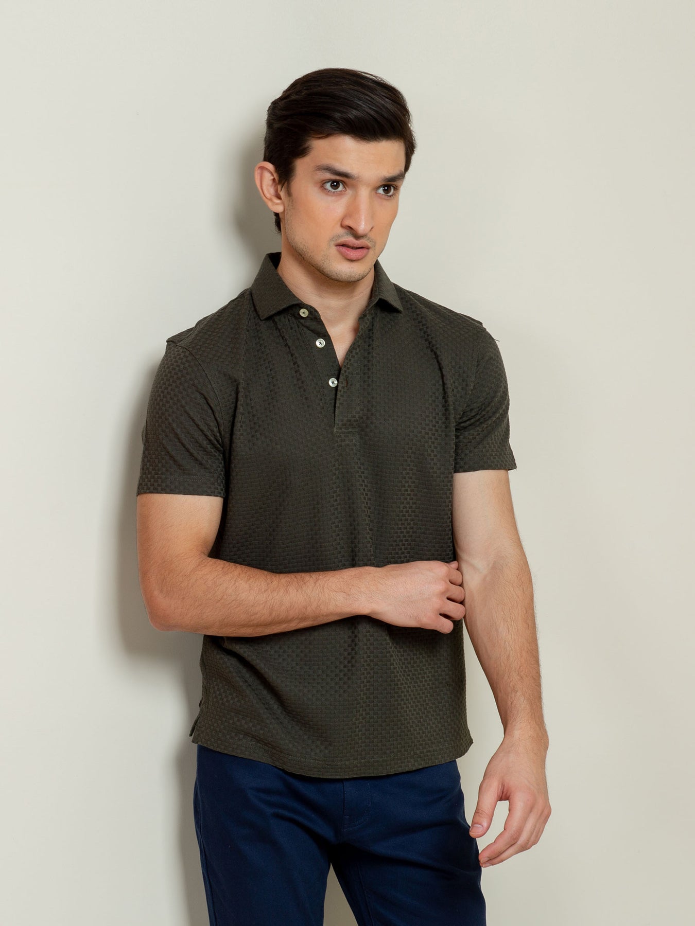 Classic style jacquard polo in luxurious mercerized fabric with superb hand-feel. Featuring classic cutaway collar, this summer style choice features contrasting ribbon detailing with branded buttons & short sleeves. This olive green polo never gets out of style