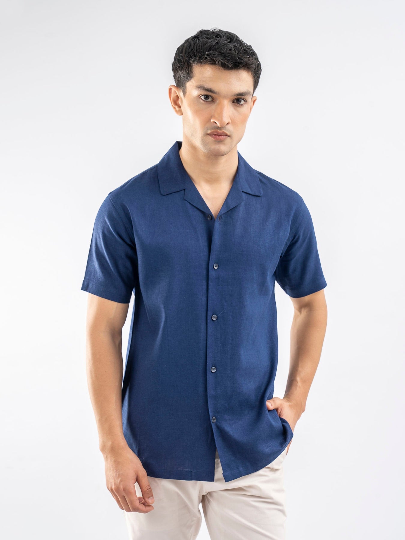 Opt for a cool look with our blue linen blended cuban collar shirt. With its open notch lapel-like collar, it gives a relaxed and laid-back vibe, perfect for casual outings or beach gatherings. Linen makes this casual shirt airy and light weight