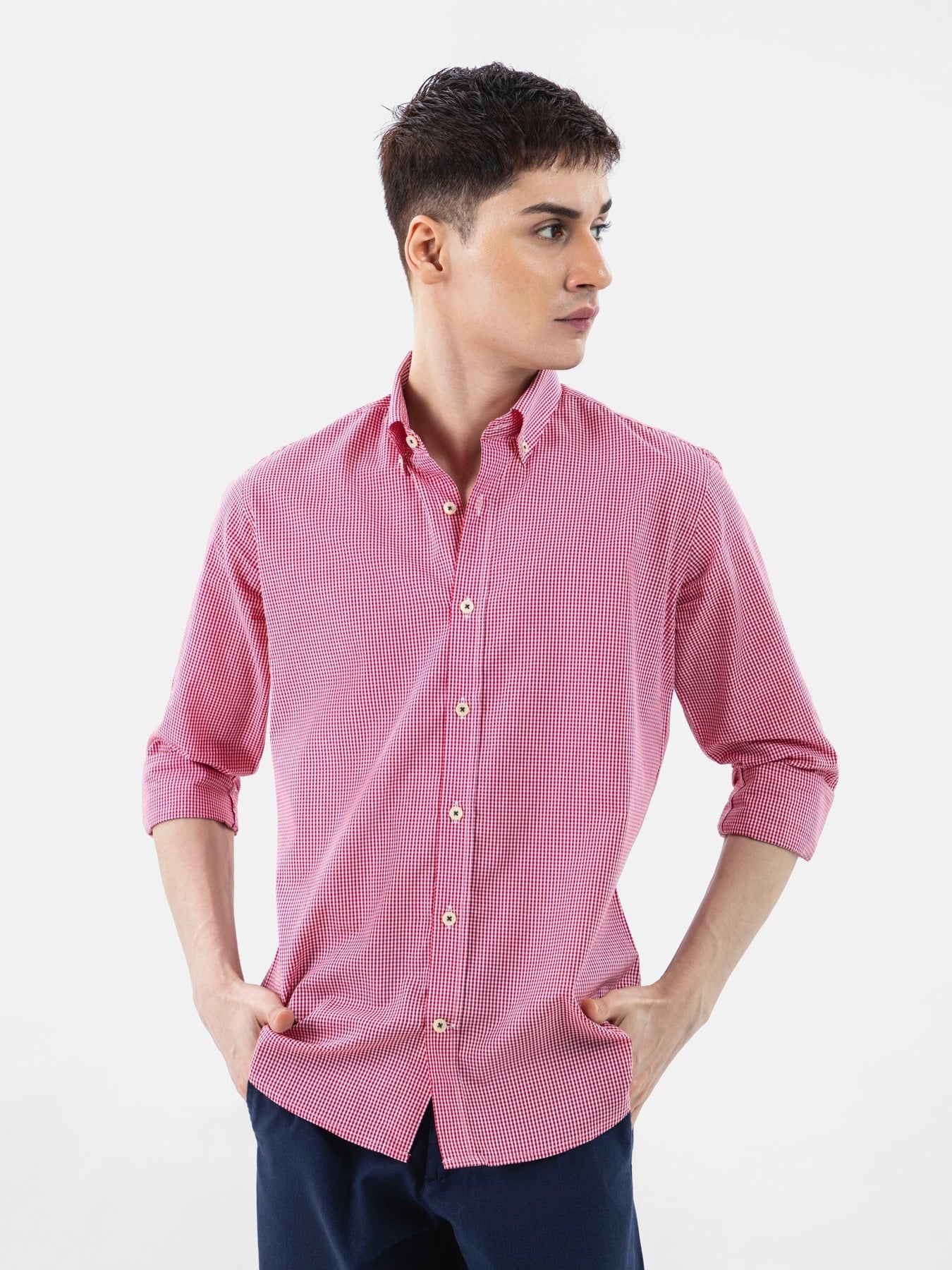 Elevate your smart casual ensemble with our mens red gingham button down shirt, boasting a refreshing light red color that exudes laid-back charm. Featuring a button-down collar, this shirt seamlessly blends casual comfort with polished style. Pair it with navy blue chinos for a perfect look