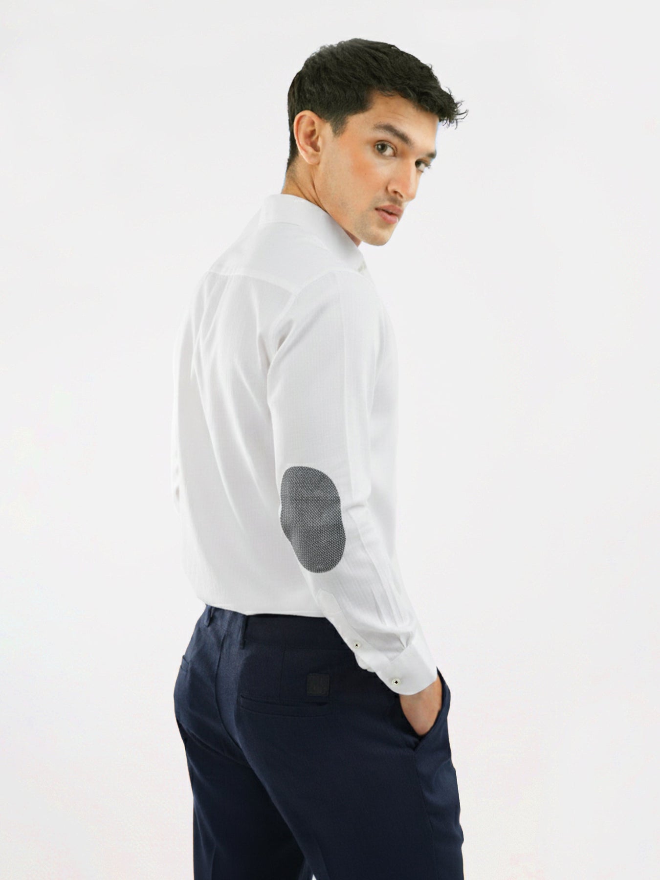 A classic oxford shirt redefined with modern detailing. Crafted from durable, textured cotton, it features a button-down collar and structured elbow patch for added style. Perfect for smart-casual wear, this versatile white shirt combines timeless sophistication with everyday practicality.
