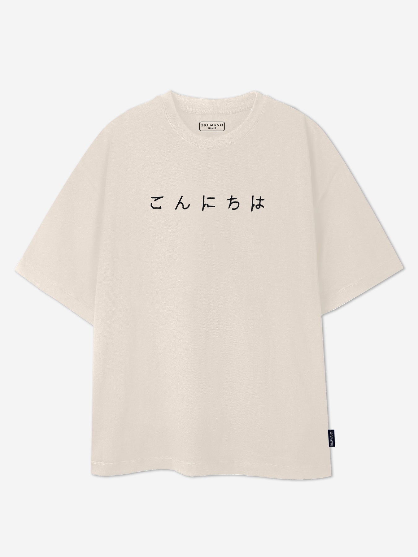 Elevate your everyday look with this beige oversized t-shirt featuring minimalist Japanese embroidery 'Hello'. Crafted from soft, breathable cotton, it offers a relaxed shoulder drop fit and subtle style perfect for modern streetwear look