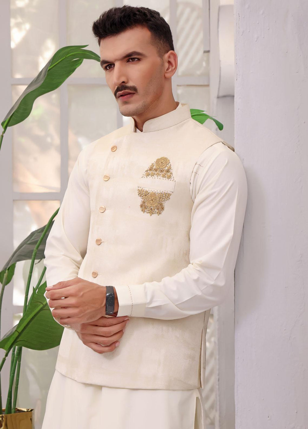 The Great Master (TGM) Wash N Wear Festive Waistcoat 3 Piece Suit for Men - Moon White