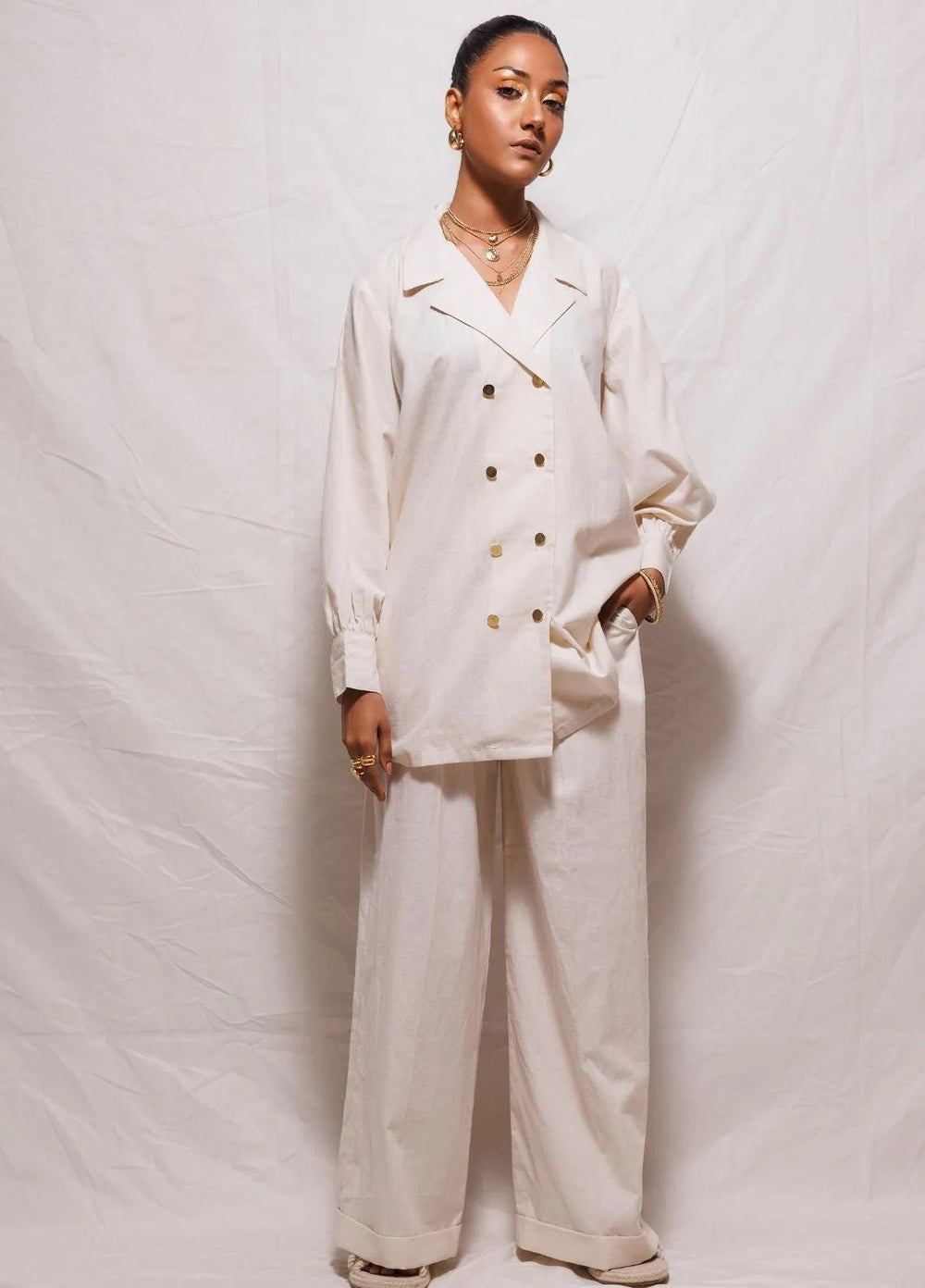 - Double-breasted button down shirt with gold buttons.