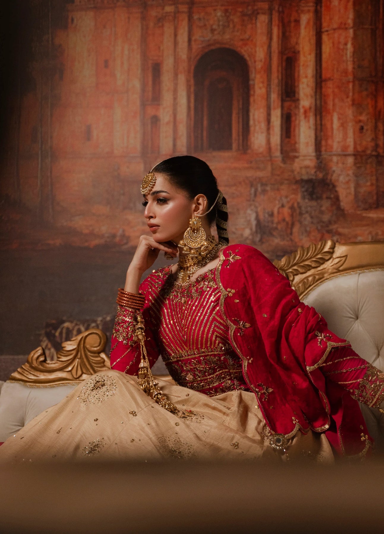 LIA - Festive Formal - VOL 3: A glamorous fuchsia pink hued choli is elevated with khaddi net dupatta, resplendent in a cutwork scallop border embroidered with zardoze and sequins. The gold Korean rawsilk voluminous lehenga creating a regal contrast, embellished with handwork motifs, pairing perfectly with a fully embroidered choli cut from Korean rawsilk fabric. The hand embroidery details in gold create a floral borders of zardoze, resham, and glistening sequins chevron on the choli. Sleeve hem and dupatta edges finished with tassels; evoking a timeless charm.