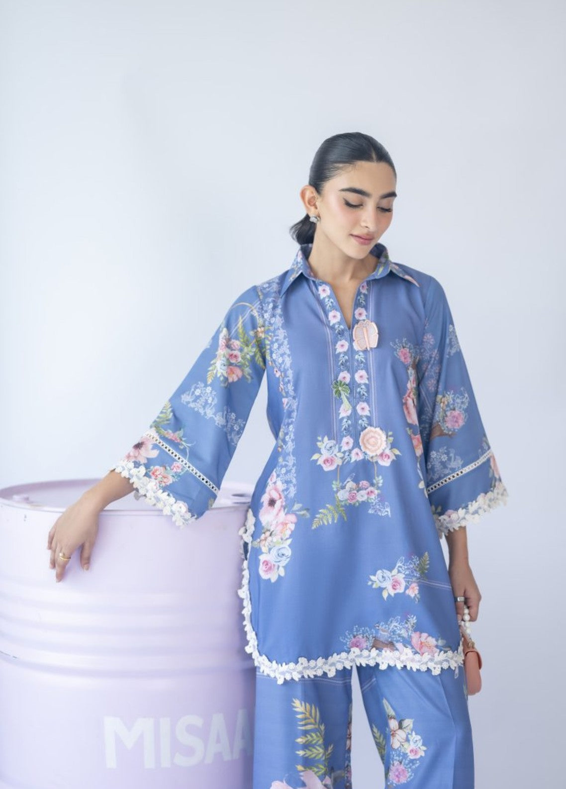 A floral print two-piece set featuring a 3D motif on the neckline and delicate white 3D lace inserts on the sleeves and culottes — feminine, fresh, and effortlessly chic.