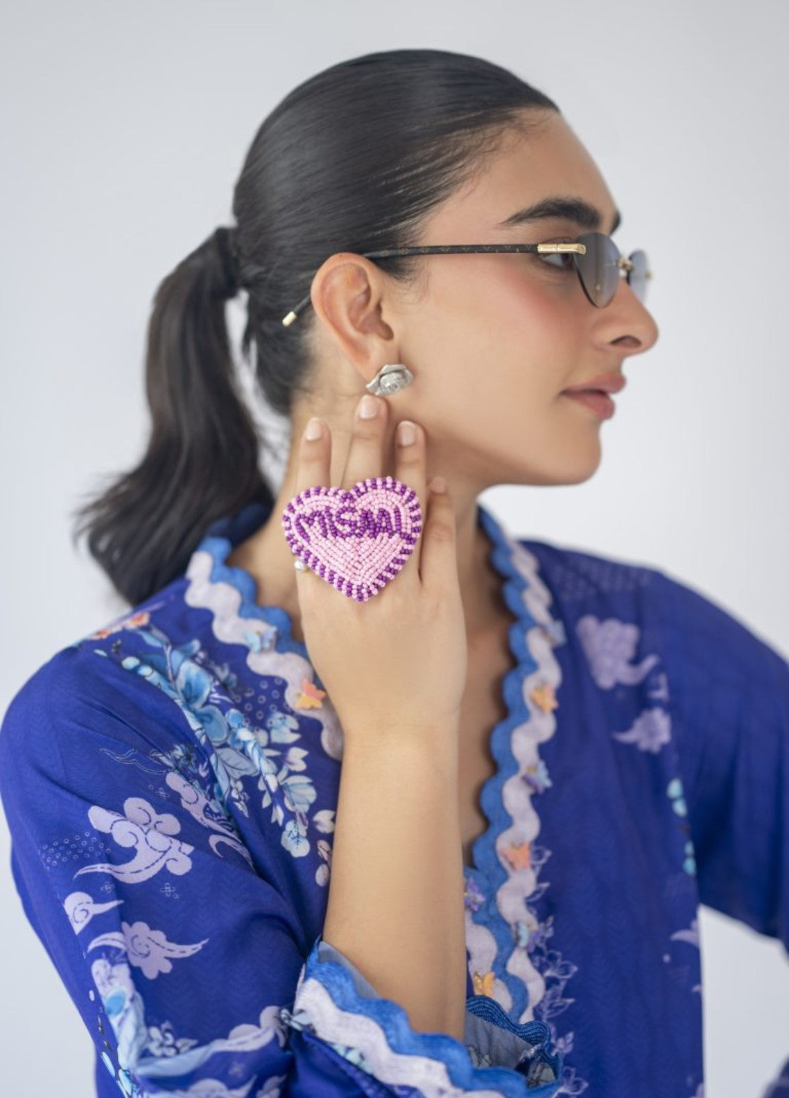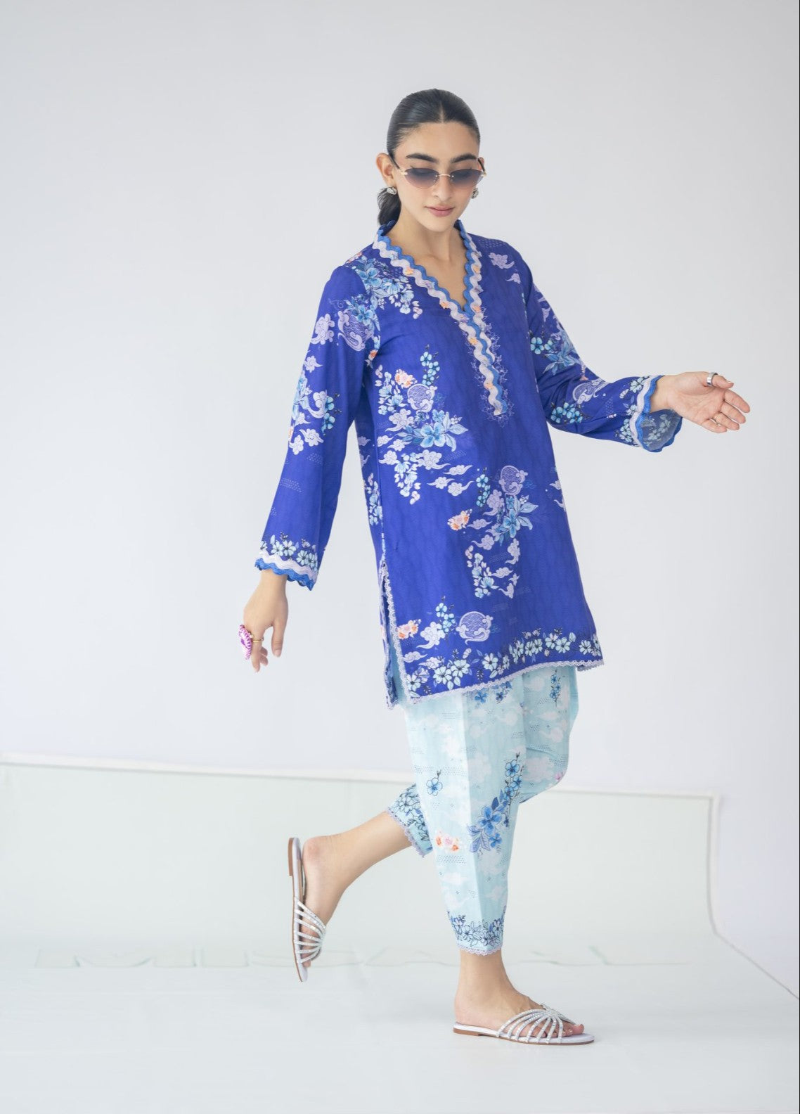 A breezy ocean print brought to life on luxe lawn silk. Accented with lace inserts and neckline charms, and paired with a powder blue shalwar, this look captures the spirit of coastal ease and timeless elegance.