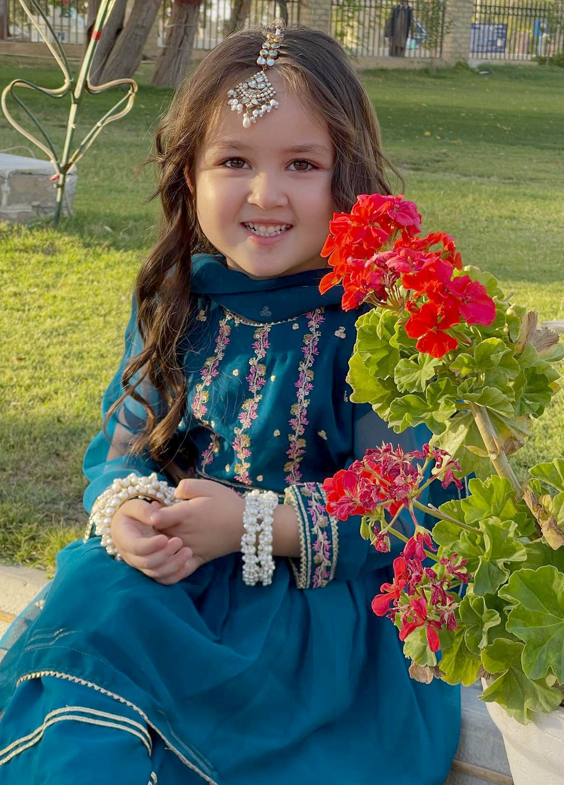 This beautiful blue peplum features embroidered neck work detailing. Paired with a gharara