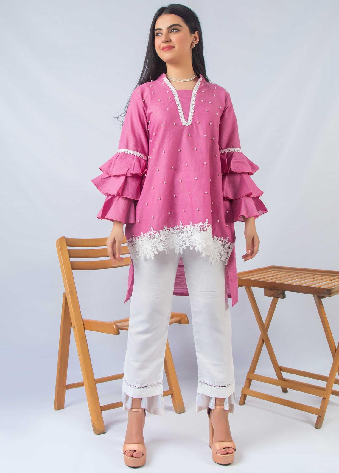 Size worn by model: small Suit: 1 piece Fabric: khaddar Detailing: Ravishing tea pink kurti with pearls all over it and a white heavy lace on front hem with 3 layered frill sleeves and light lace over neck and sleeves Color options: Green and Pink