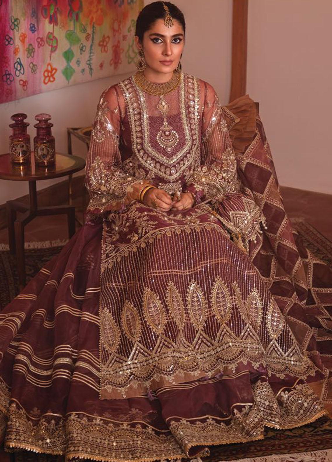 A cloudy mauve organza base is embroidered in shades of dull gold and tilla. The shirt is amply embroidered in geometric and Chand Bali motifs and hand embellished with dabka, sitara, gotta panni. It is paired with an organza sharara with embroidered panni and resham borders. The dupatta sports our signature tri toned chatta pati style jaal.