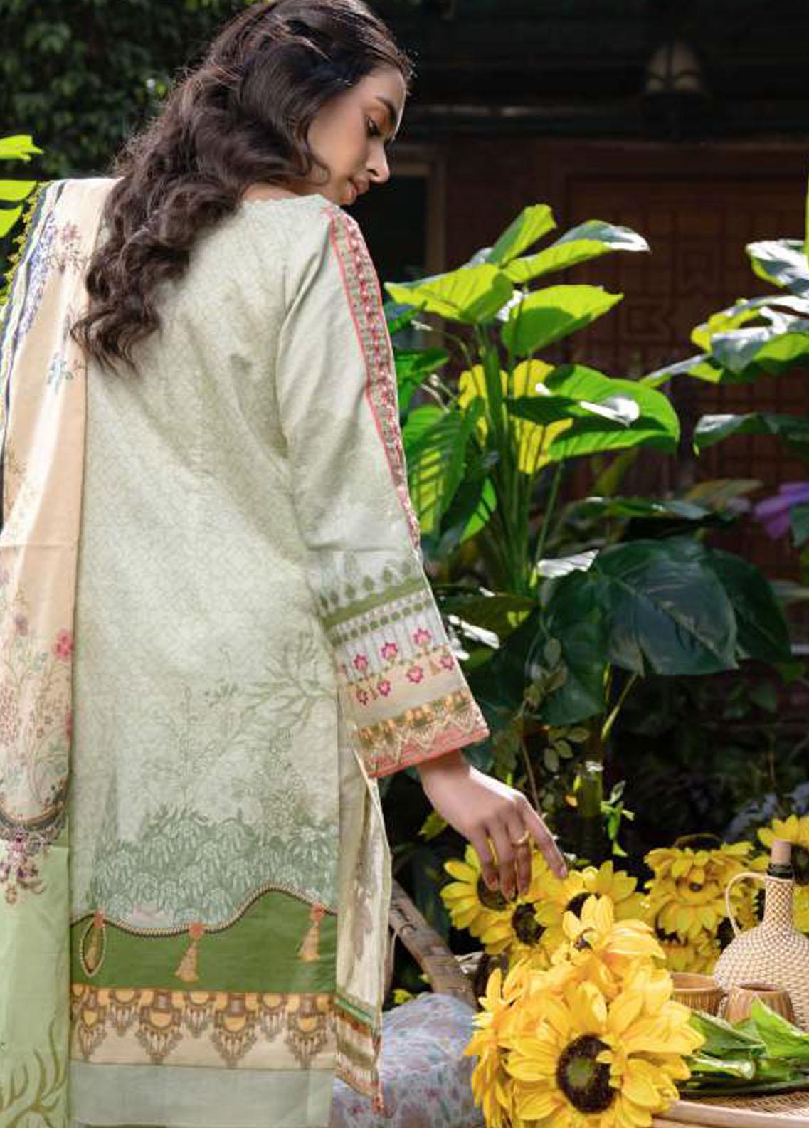 Digital Printed Lawn Front 1.14 M Digital Printed Lawn Back 1.14 M Neckline Embroidered Patch 1 Pc Embroidered Patch A For Front Daman 2 Pc Embroidered Patch B For Front 0.94 M Digital Printed Lawn Sleeves 0.67 M Sleeves Embroiderd Patch 2.2 M Digital Printed Lawn Dupatta 2.5 M Dyed Cotton Trouser 2.5 M