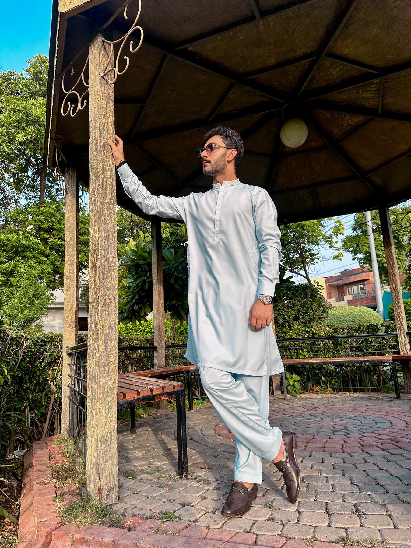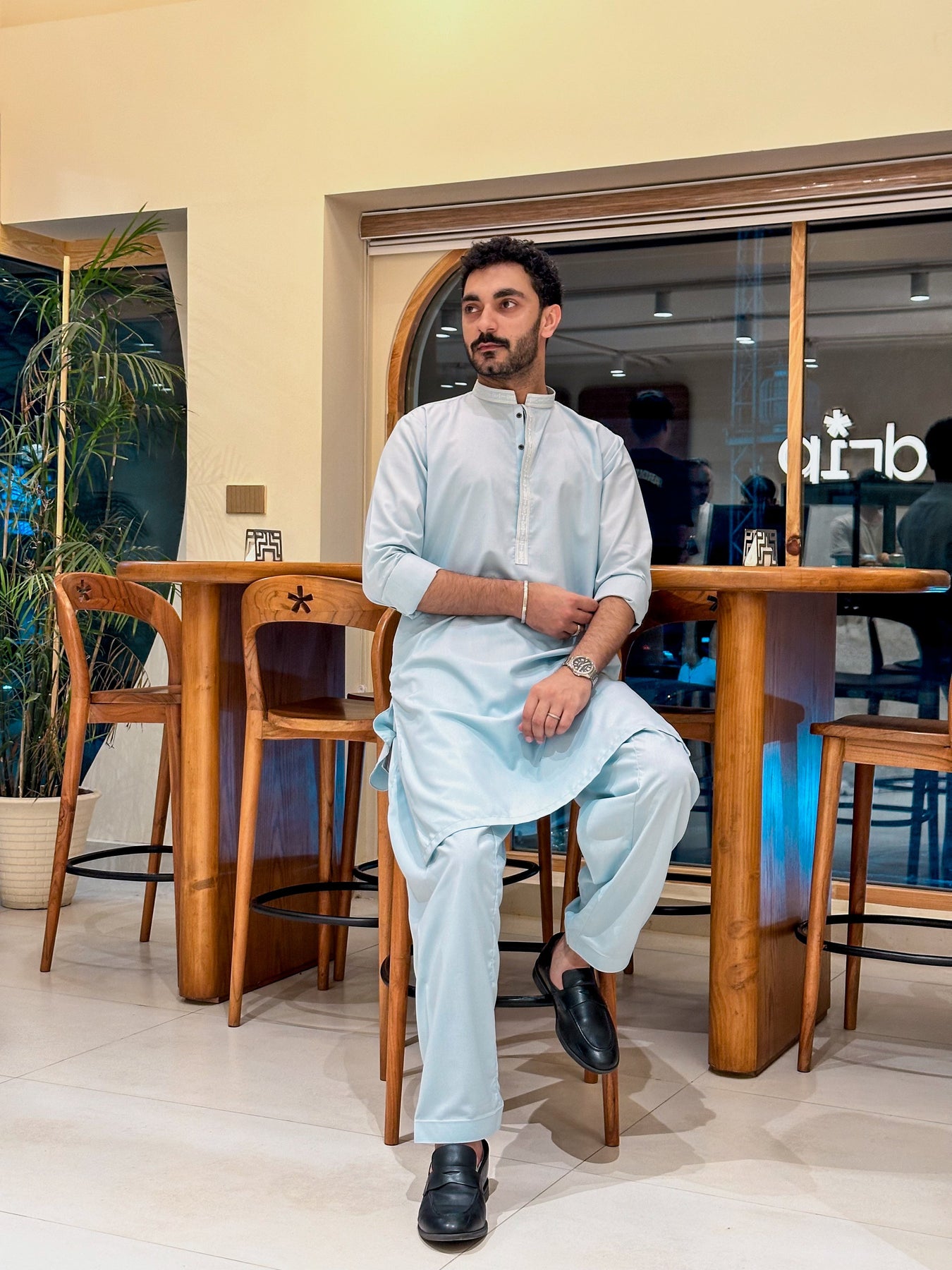 Elevate Your Style With The Formal Sky Blue Kurta Shalwar For Men—Featuring A Falling Collar Neck And Exquisite Embroidery. This Elegant Ensemble Combines Traditional Craftsmanship With Modern Flair, Making It Perfect For Formal Events And Celebrations.