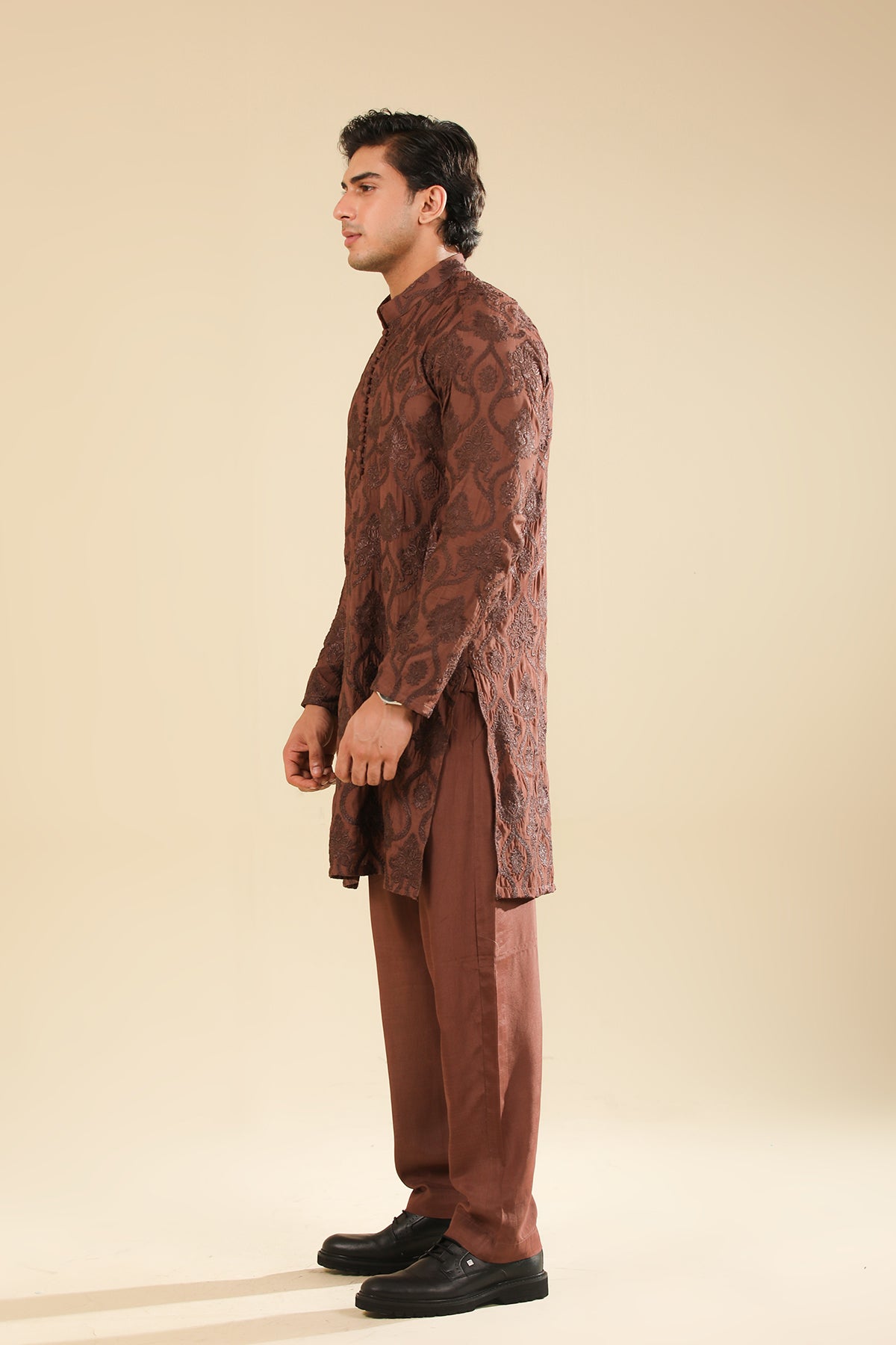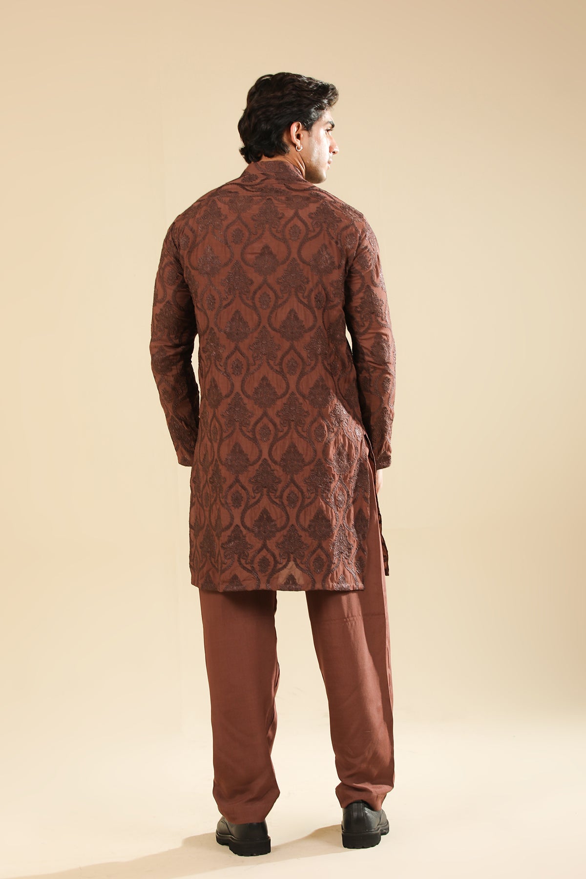 Muraqsh Ready To Wear Embroidered Silk Men Faris Cocoa Brown Kurta Trouser MUR-F-CBR - Winter Collection
