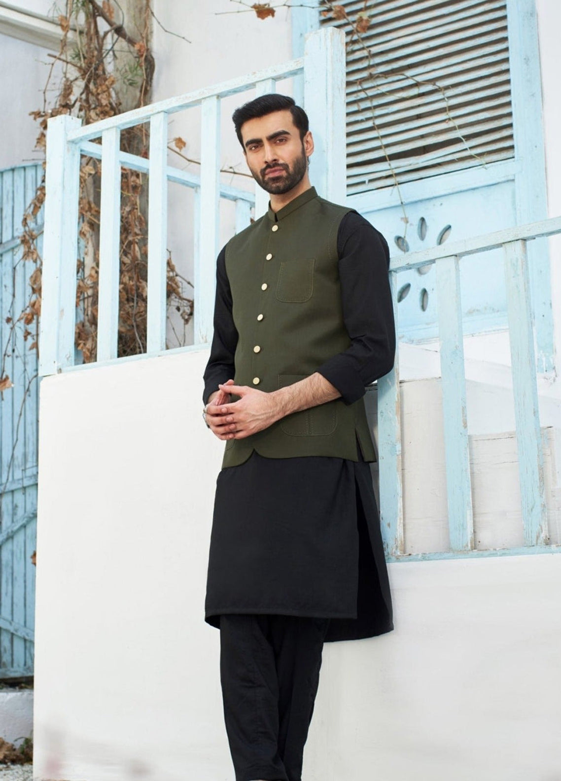 Muraqsh Ready To Wear Solids Cotton Men Black Kurta Trouser with Army Green Suiting Waistcoat Round Cut MURP-AG-KS - Summer Collection
